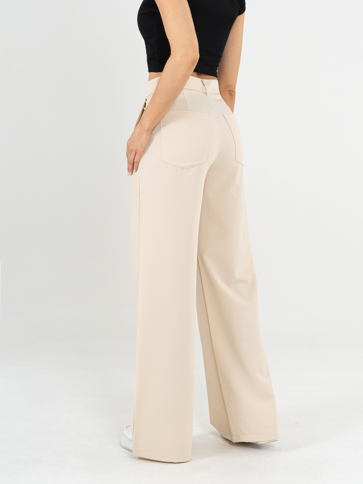 Pantalón palazzo, stretch, sin prenses, tejido plano liviano, tono arena, tiro alto, bolsillo diagonal, silueta amplia.