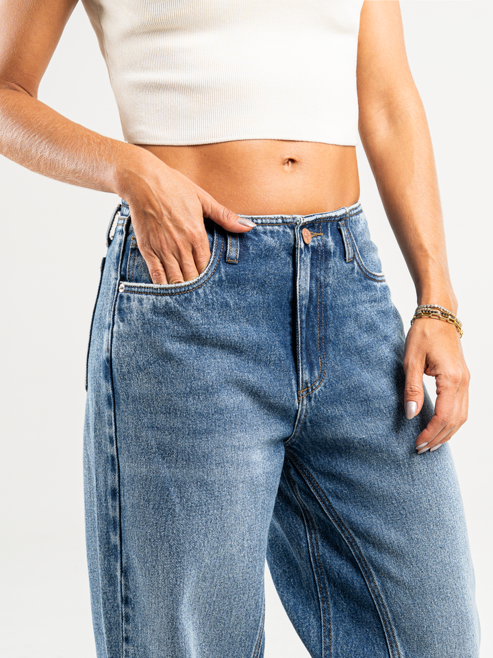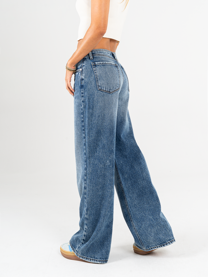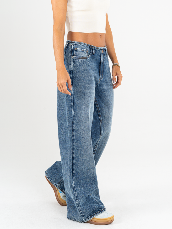 Jean  palazzo rígido, tiro alto, tono azul oscuro, corte en entrepierna, cintura ajustada y pierna holgada.
