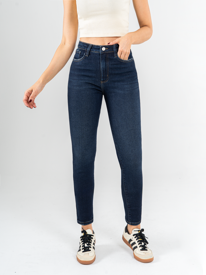 Jean Skinny stretch, tiro alto, tono azul oscuro, cintura ajustada y diseño cinco bolsillos.