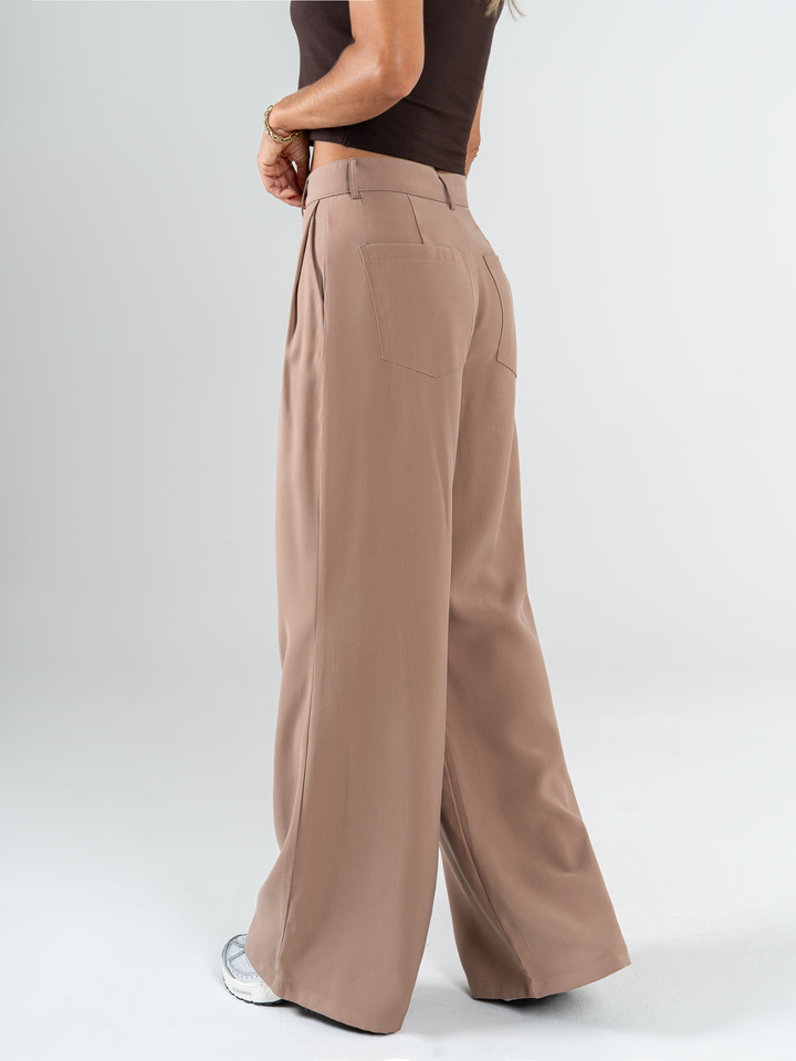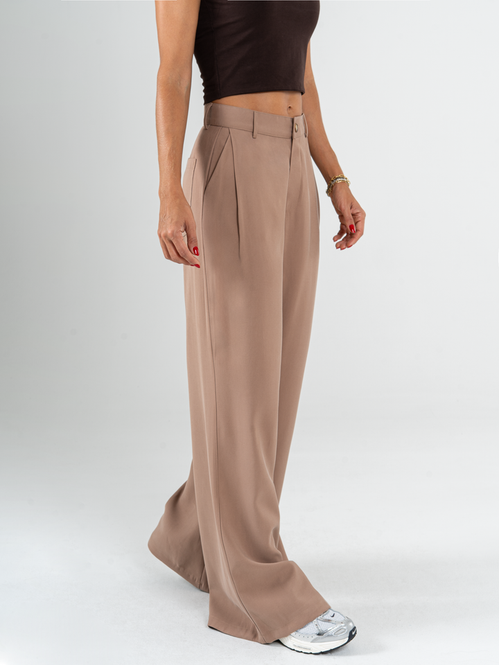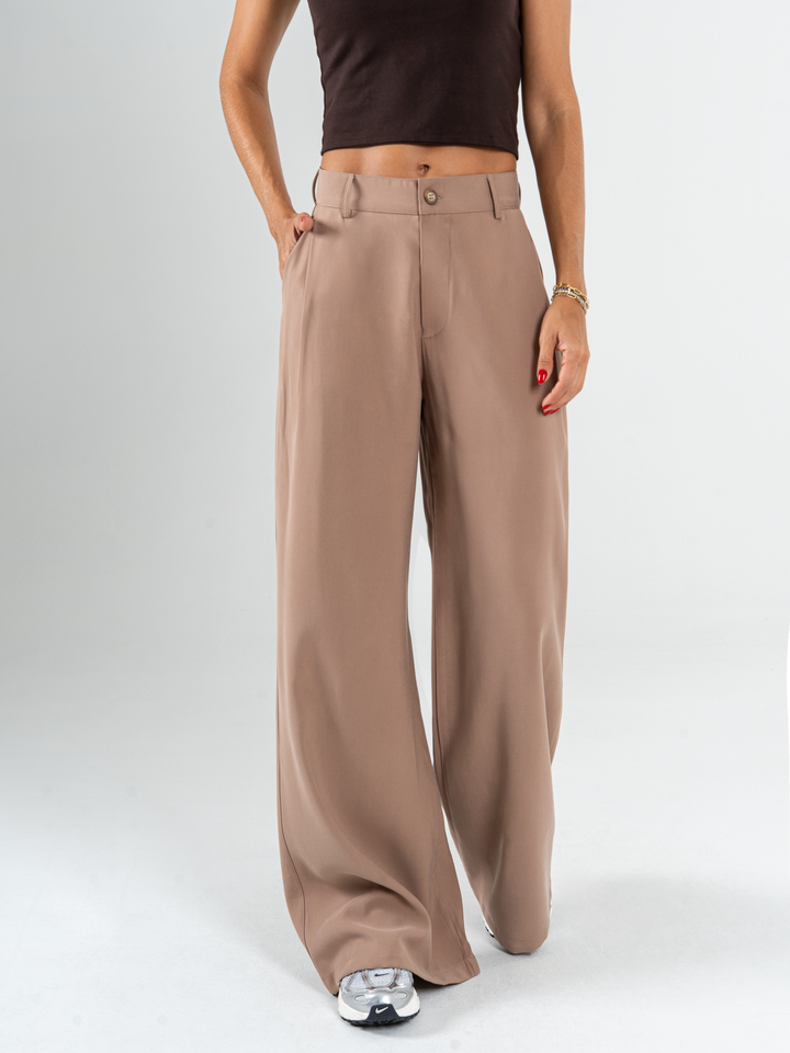 Pantalón palazzo, prenses, tono cafe, tejido plano liviano, tiro alto, bolsillo al diagonal, silueta amplia.