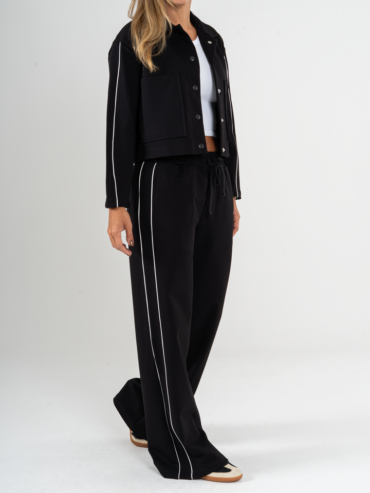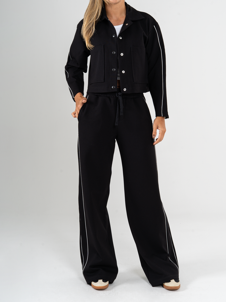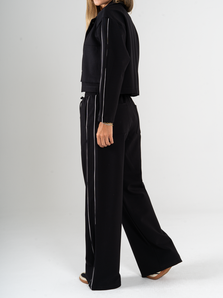 Pantalón wide leg, stretch, tejido plano liviano, sin prense, tono negro, vivo en costado, tiro alto, silueta amplia.