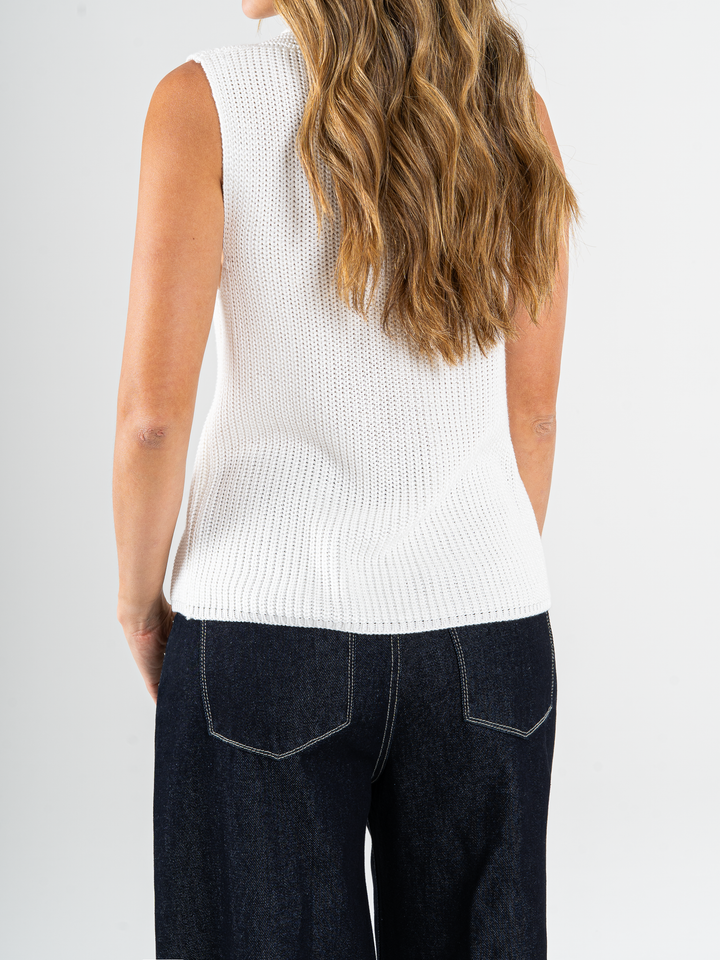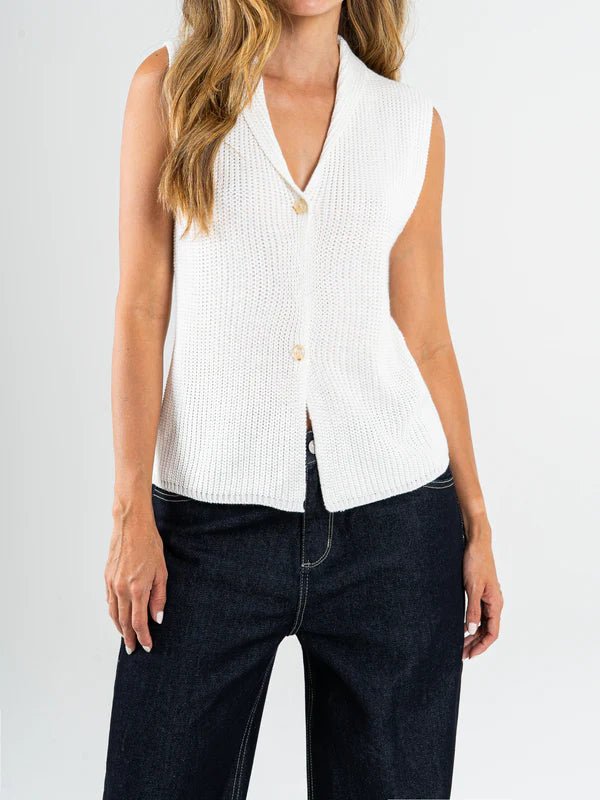 Chaleco tejido acanalado, con botones delantero, tono crudo, cuello con solapa.