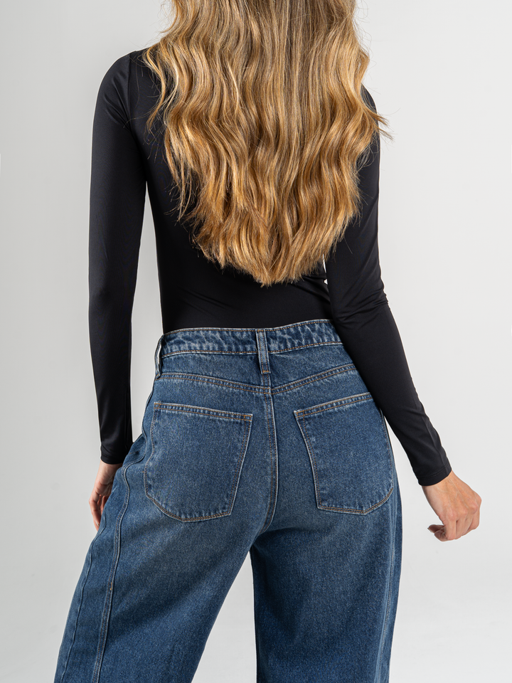 Body manga larga, cuello redondo, tono negro, cierre en bajo con botones a presión.