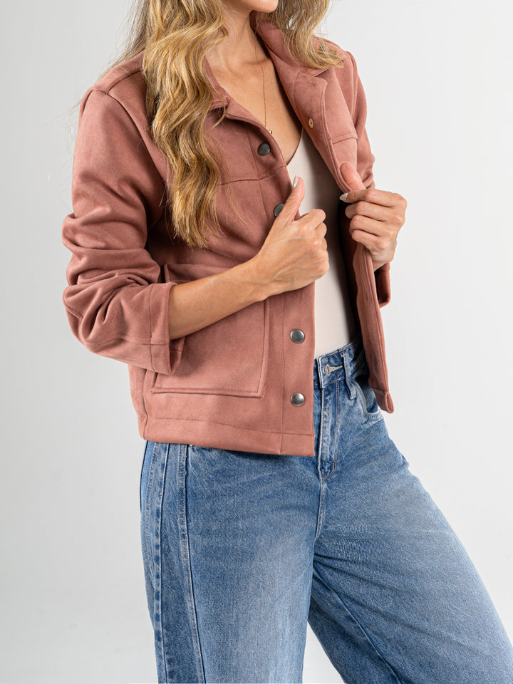 Chaqueta efecto piel, tacto suave, cuello con solapa, tono terracota, bolsillos y botones delanteros