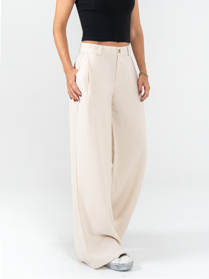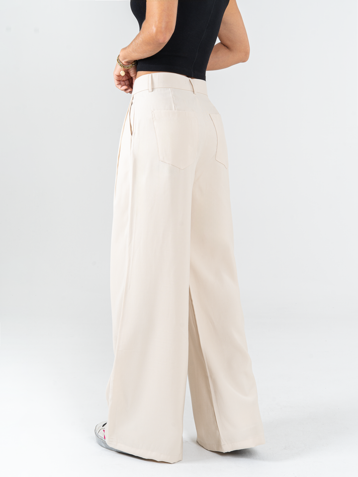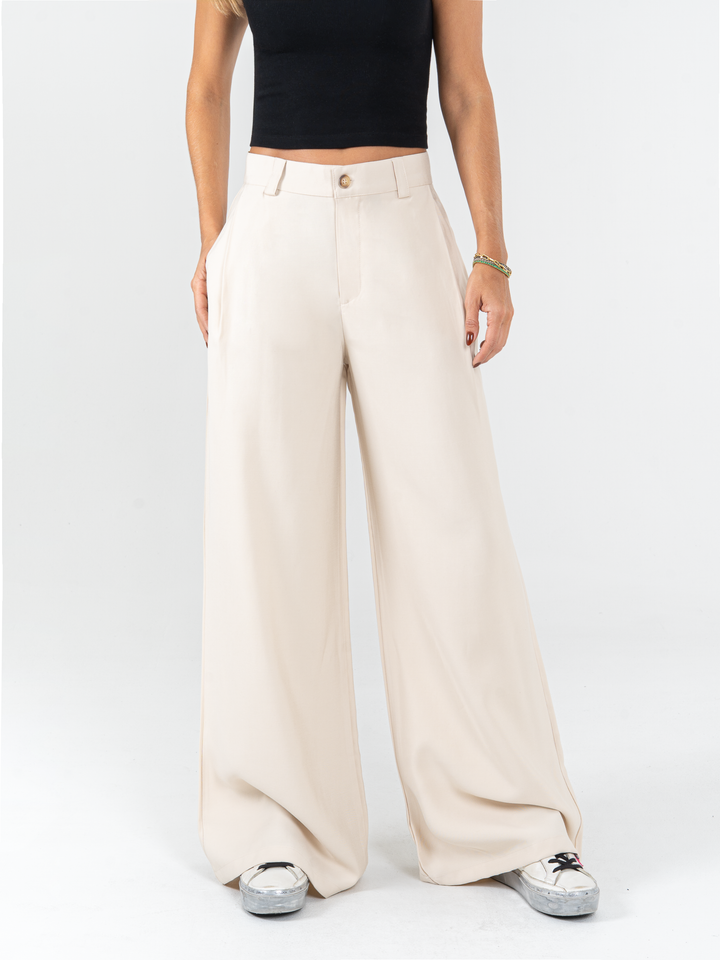 Pantalón palazzo, prenses, tono arena, tejido plano liviano, tiro alto, bolsillo al diagonal, silueta amplia.