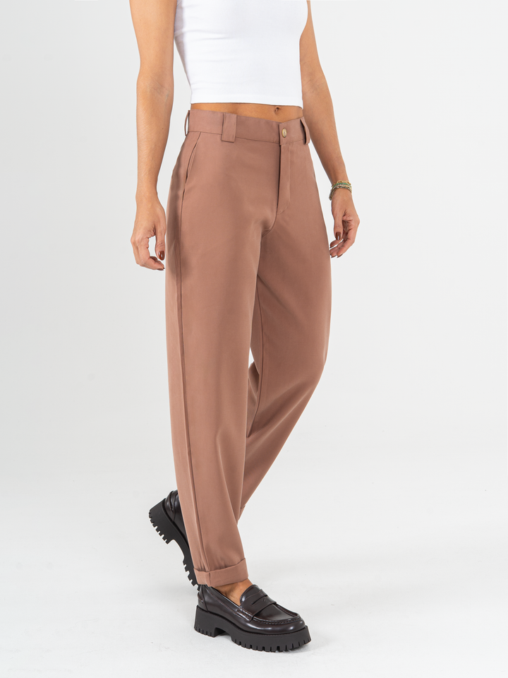 Pantalón slouchy, sin prense, tono cafe, tejido plano liviano, tiro alto, bolsillo ribete, silueta amplia.