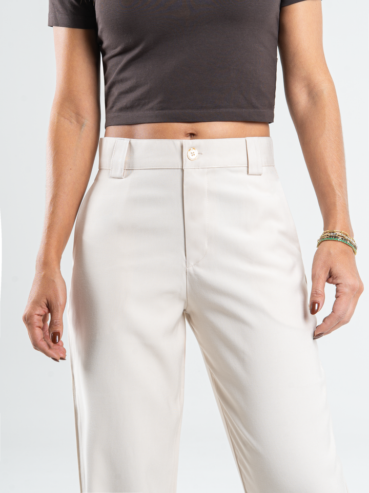 Pantalón slouchy, sin prense, tono arena, tejido plano liviano, tiro alto, bolsillo ribete, silueta amplia.