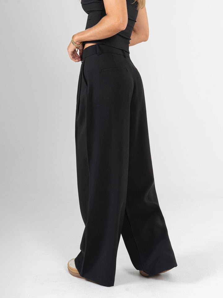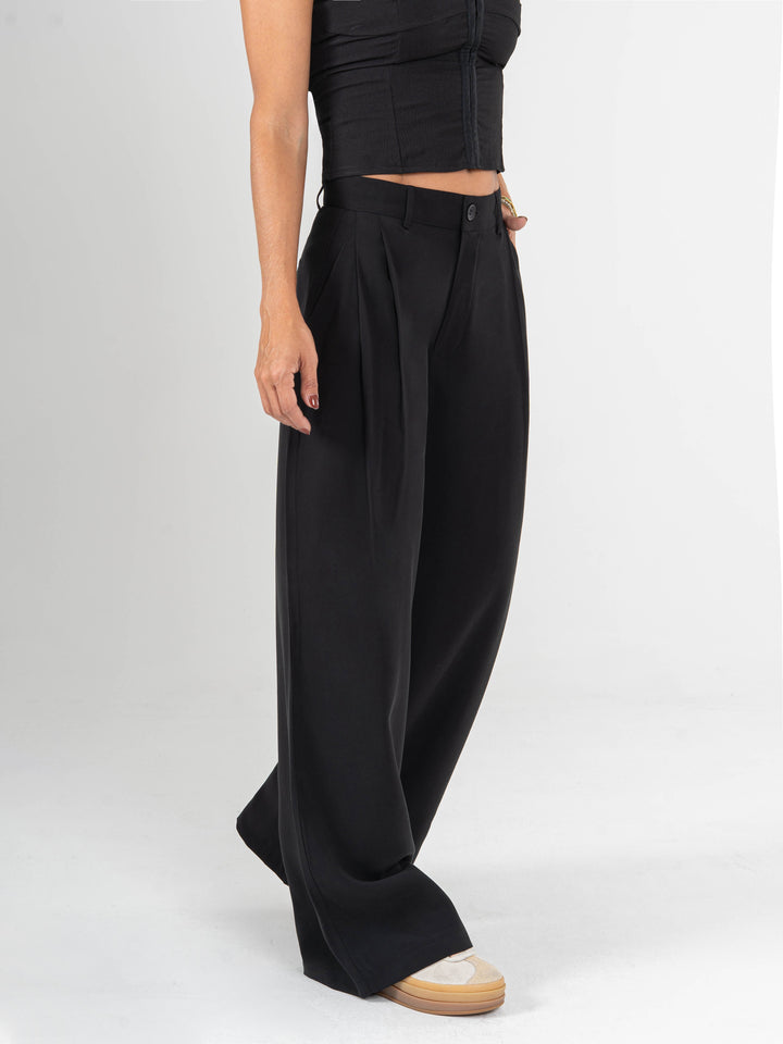 Pantalón palazzo, con prenses, tejido plano liviano, tiro alto, tono negro, bolsillo ribete, silueta amplia.