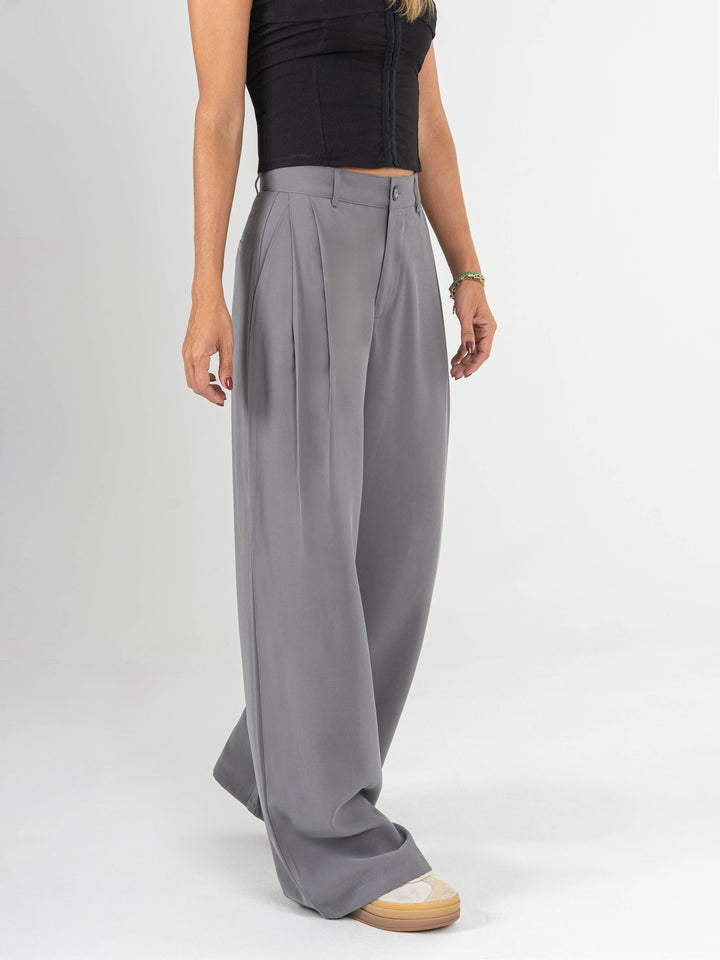 Pantalón palazzo, con prenses, tejido plano liviano, tiro alto, tono gris, bolsillo ribete, silueta amplia.