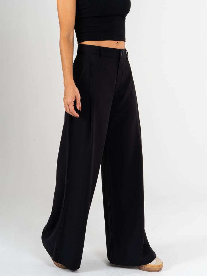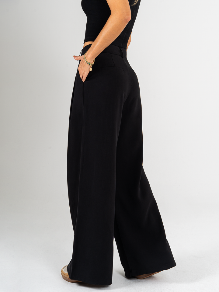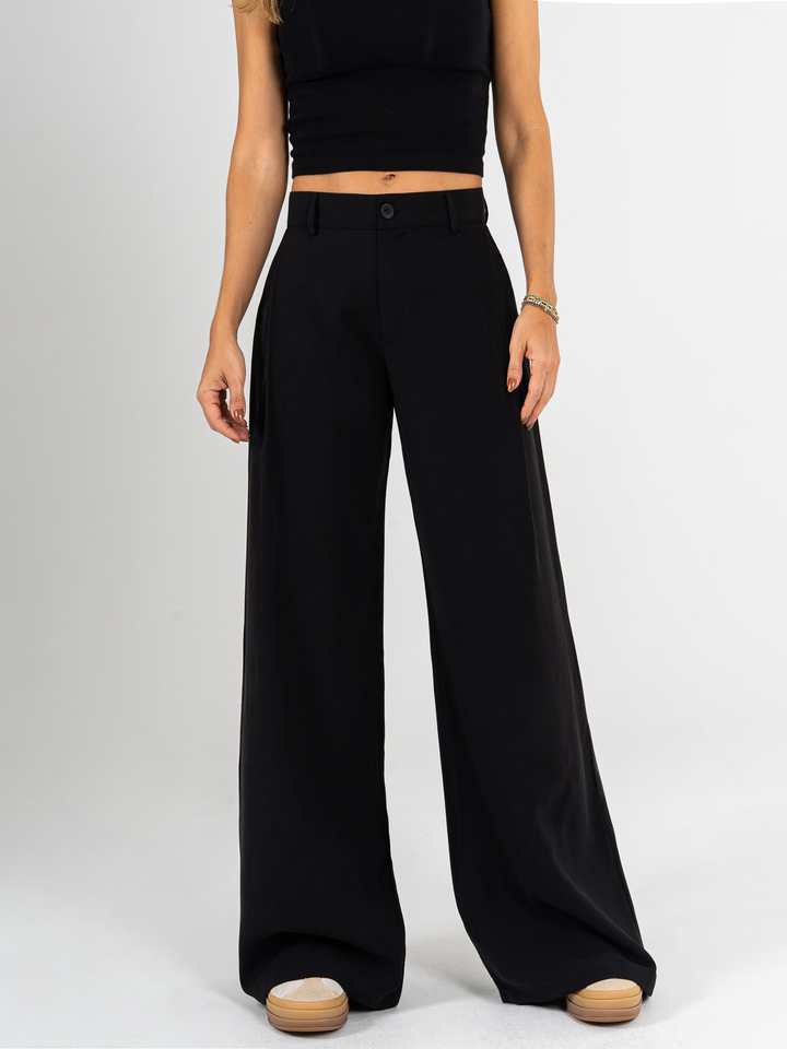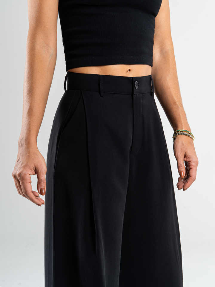 Pantalón palazzo, prenses, tono negro, tejido plano liviano, tiro alto, bolsillo ribete, silueta amplia.