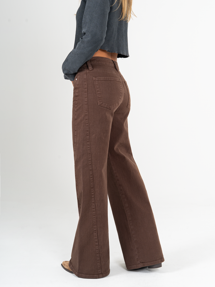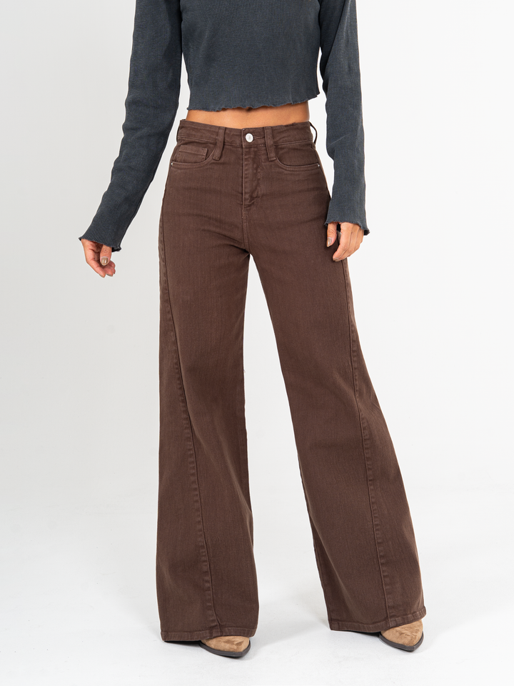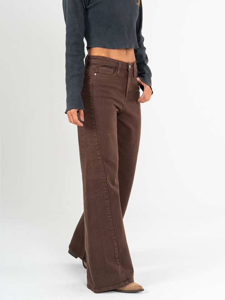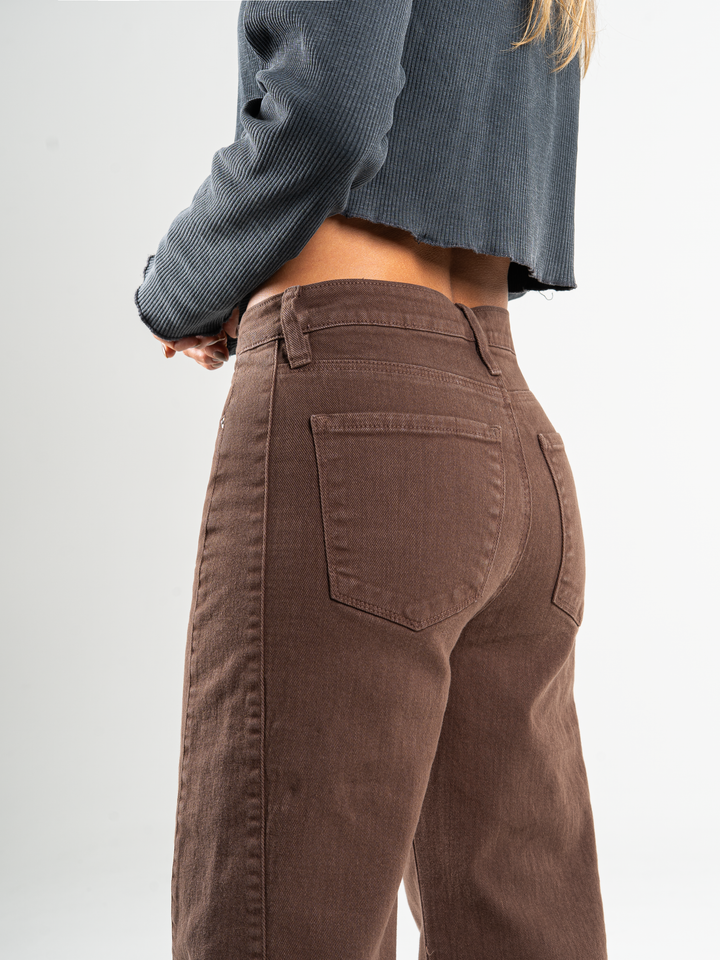 Pantalón palazzo stretch, tiro alto, tono cafe, diseño cinco bolsillos, silueta holgada