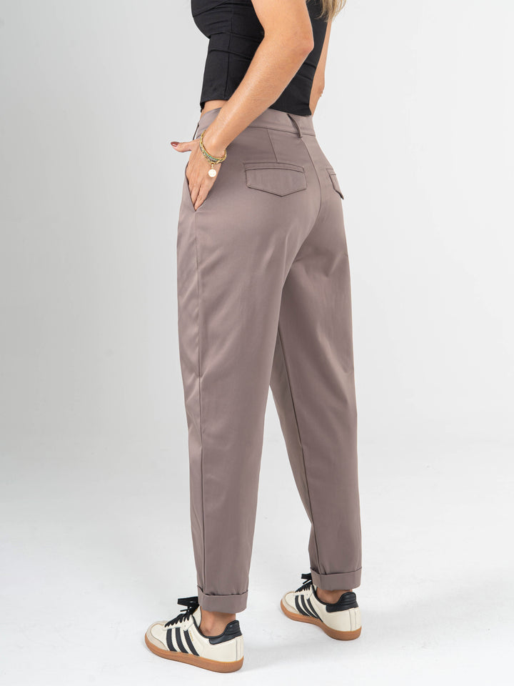 Pantalón slouchy, sin prenses, tono cafe, tejido plano liviano, tiro alto, bolsillo ribete, silueta amplia.