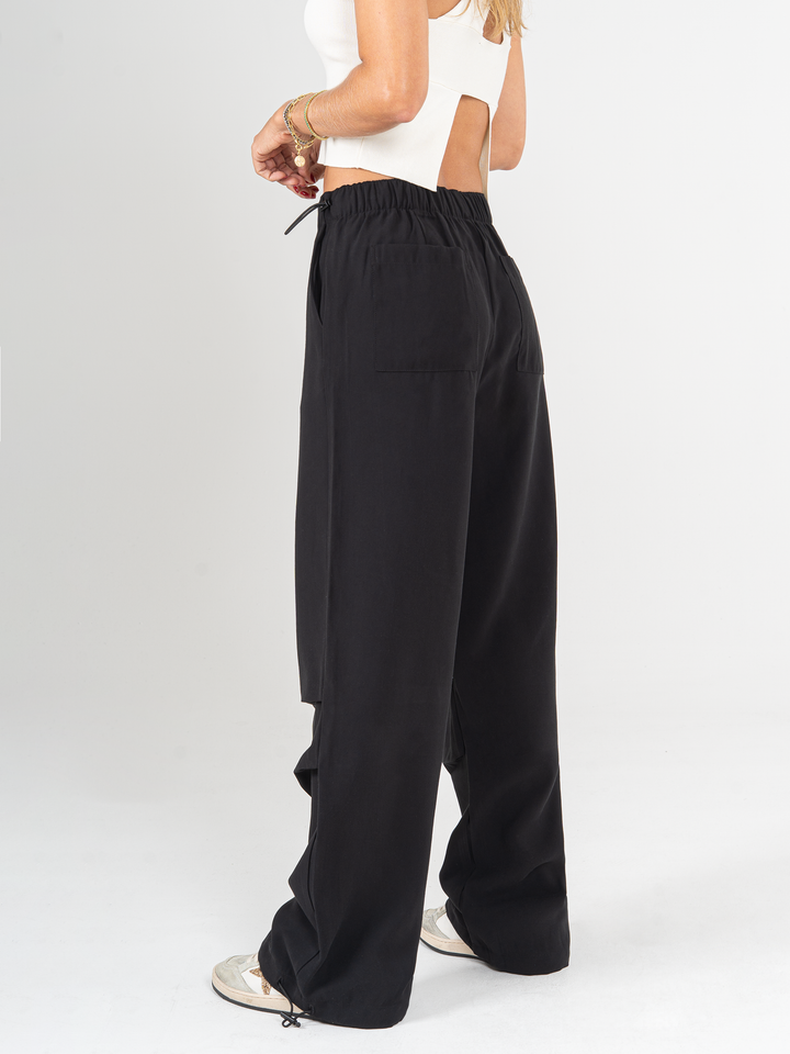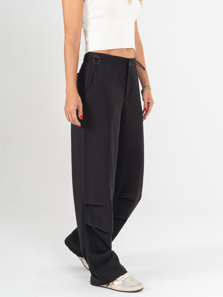Pantalón cargo, prense en pierna, tono negro, detalle en pretina, tejido plano liviano, tiro alto, diseño con ajustador en bota, bolsillo diagonal, silueta amplia.
