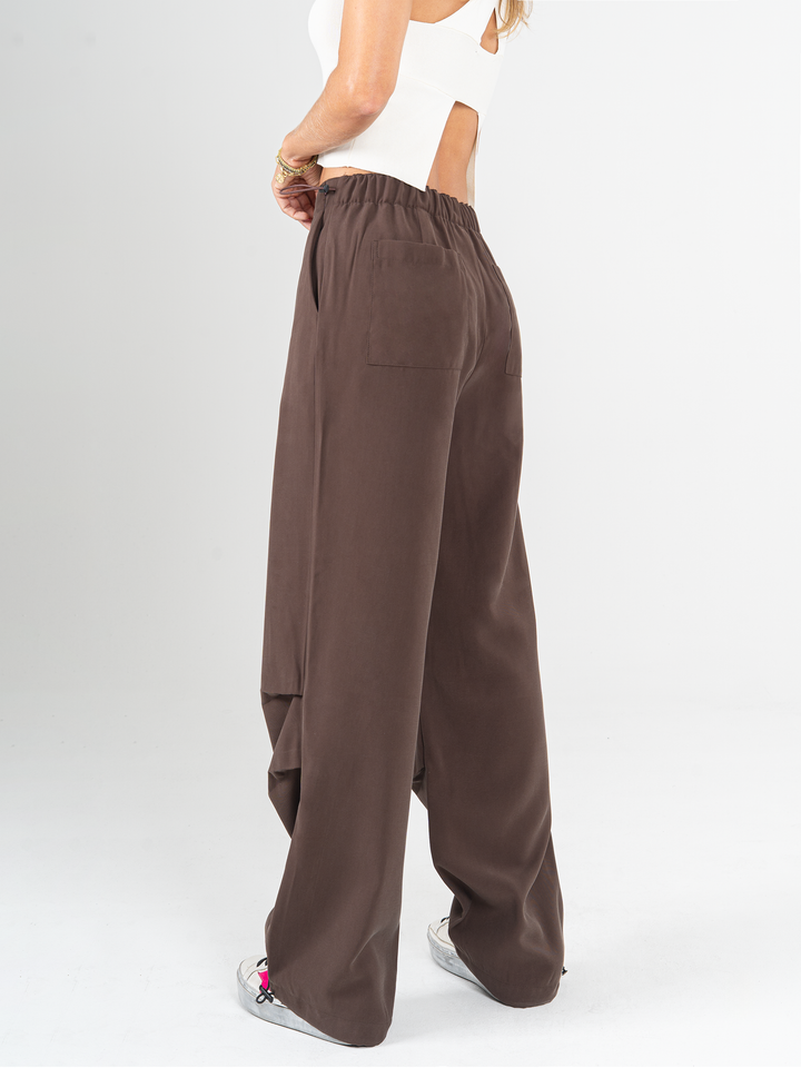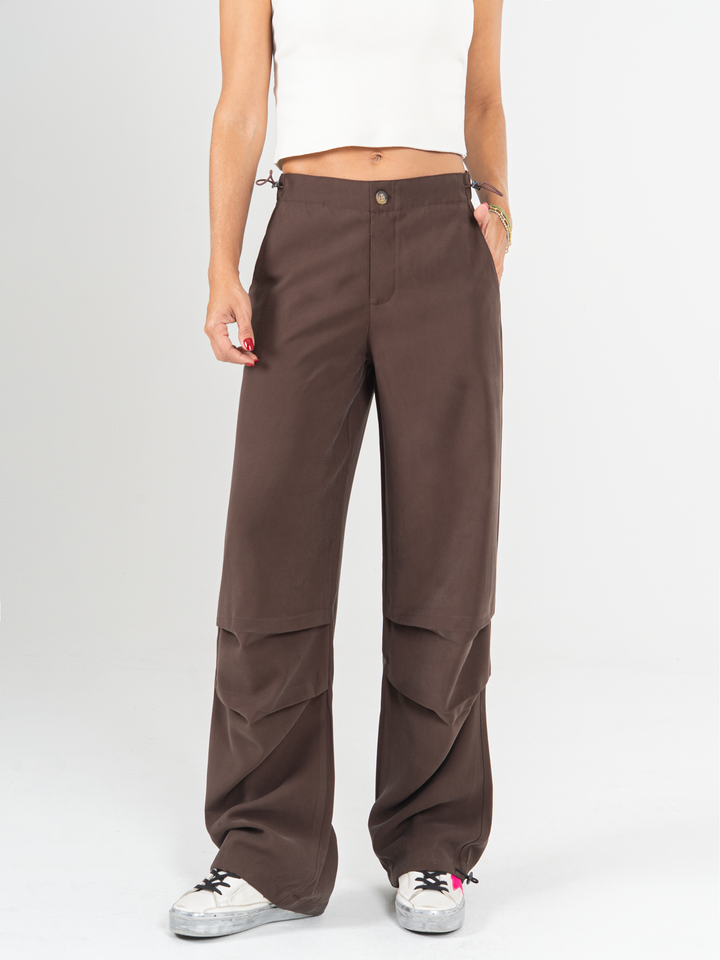 Pantalón cargo, prense en pierna, tono cafe, detalle en pretina, tejido plano liviano, tiro alto, diseño con ajustador en bota, bolsillo diagonal, silueta amplia.