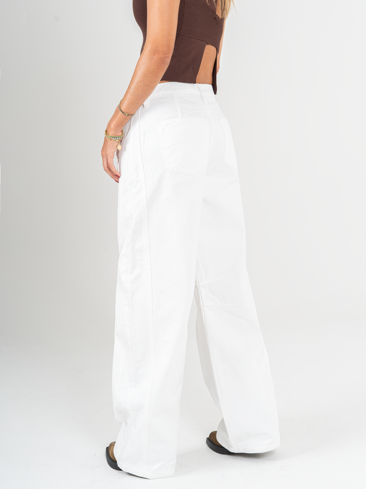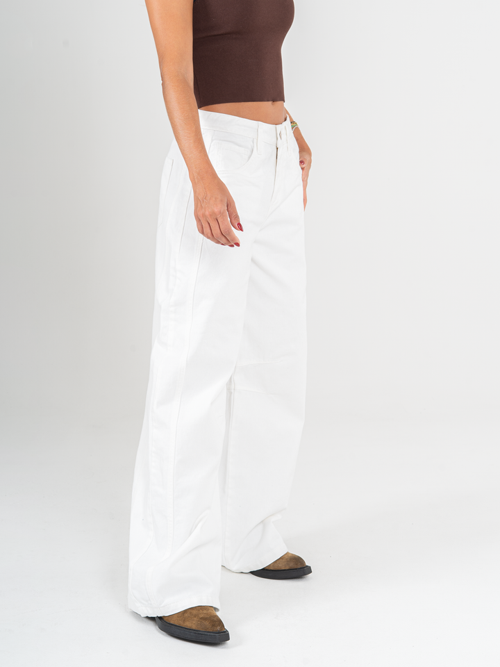Pantalón wide leg, rígido, tiro alto, corte en costado, tono ivory, diseño cinco bolsillos, silueta amplia