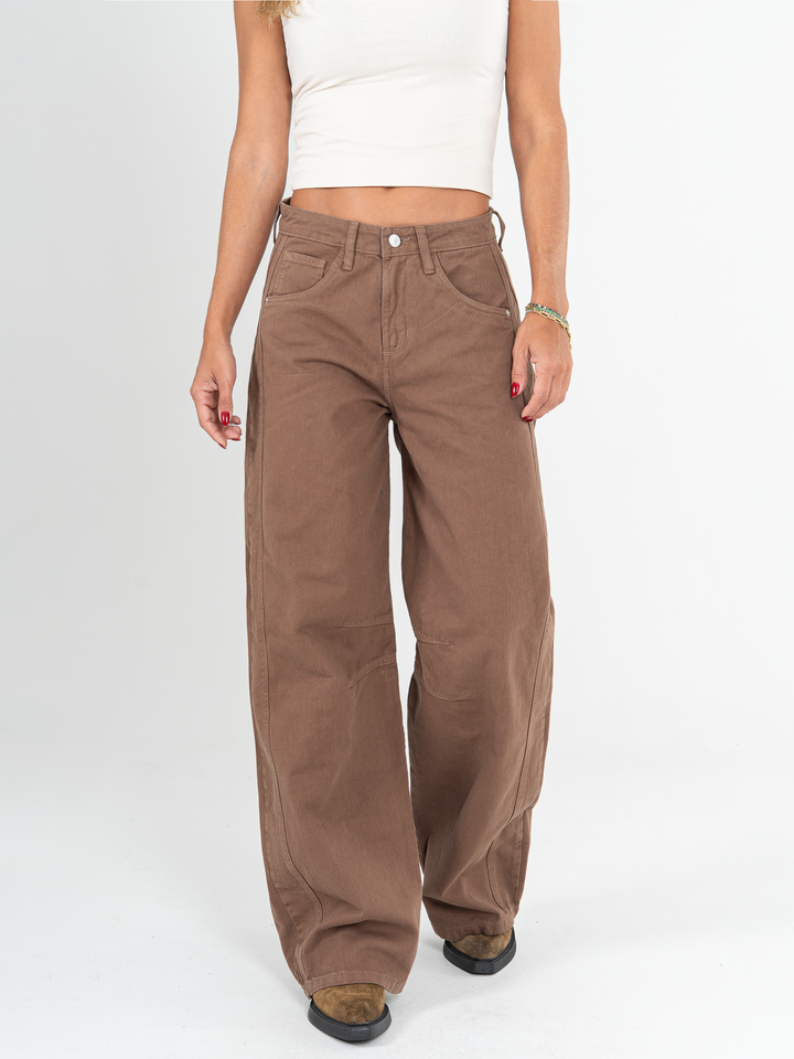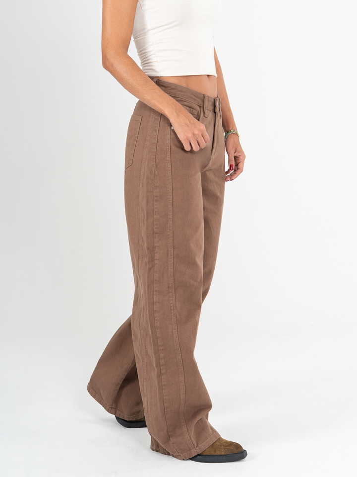 Pantalón wide leg, rígido, tiro alto, corte en costado, tono moca, diseño cinco bolsillos, silueta amplia