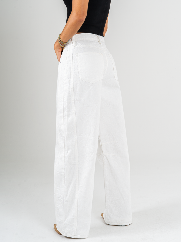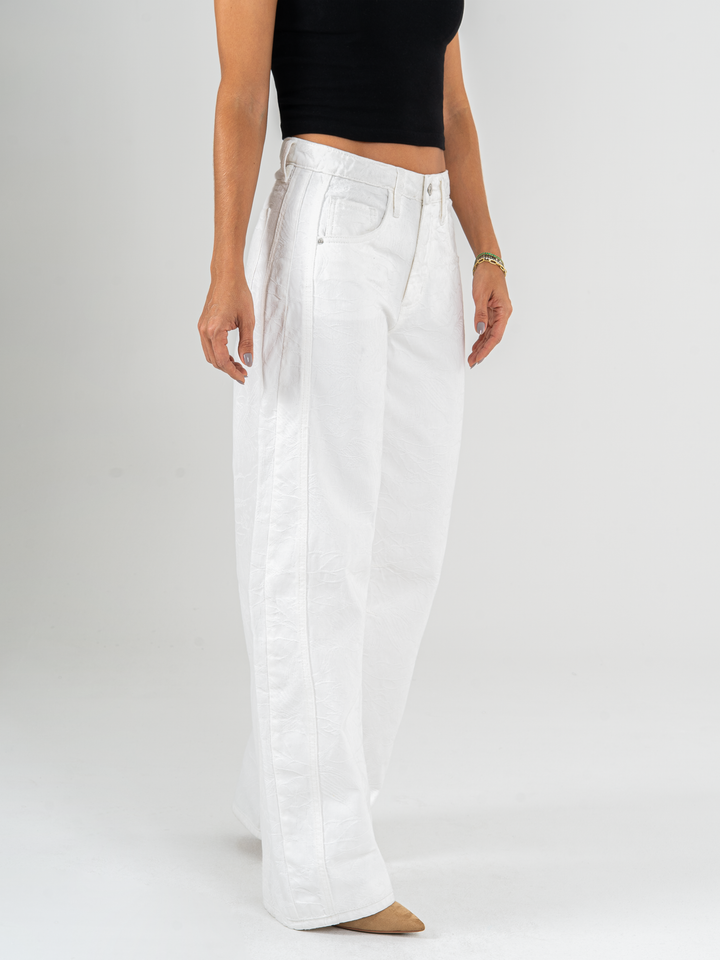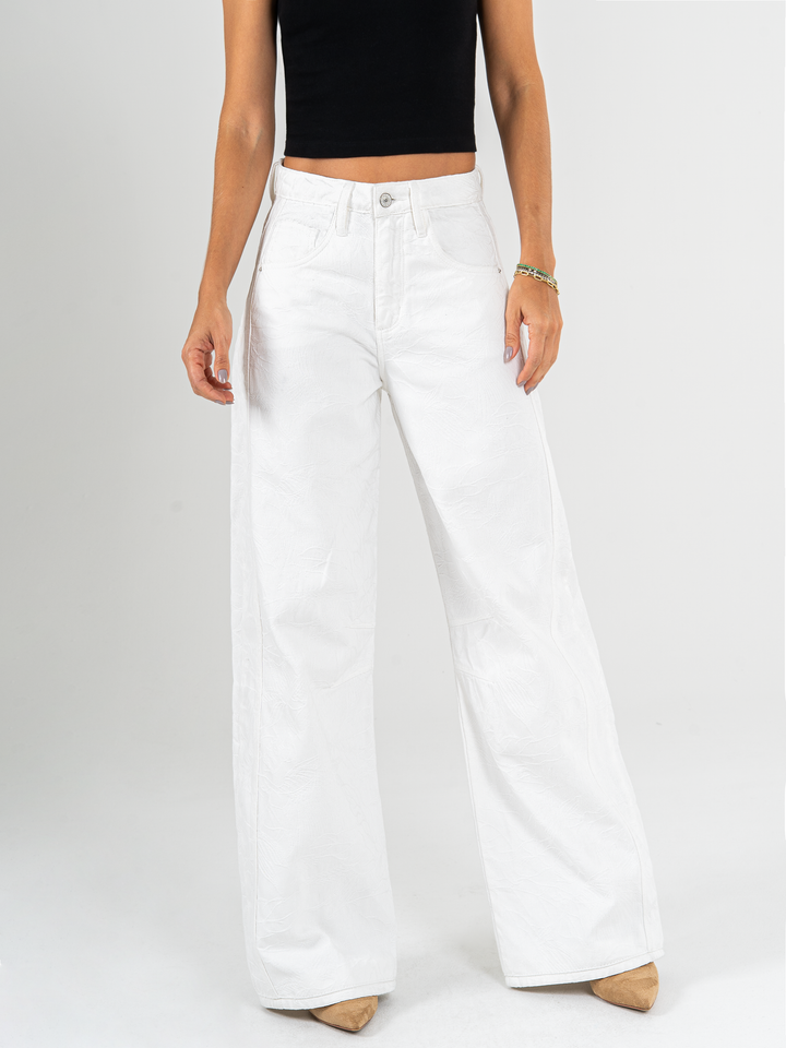 Pantalón wide leg, tiro alto,  detalle de tela bordada, rígido, tono ivory, diseño 5 bolsillos, cintura ajustada y silueta amplia de pierna recta.