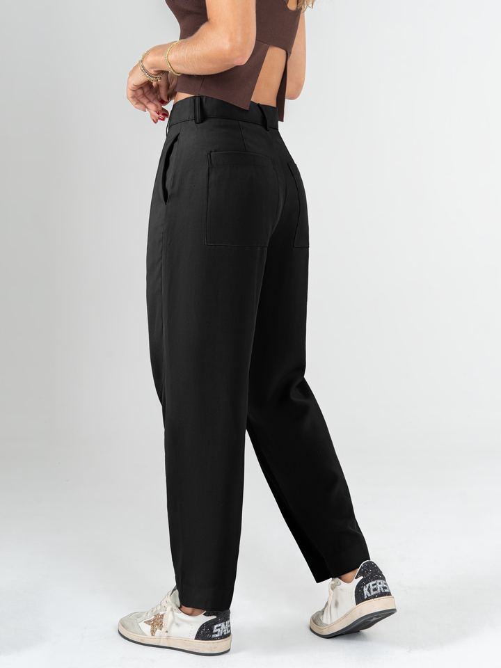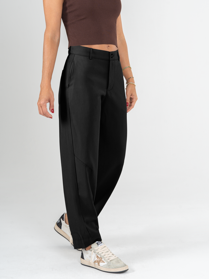 Pantalón slouchy, sin prense, tono negro, tejido plano liviano, tiro alto, bolsillo diagonal, silueta amplia.