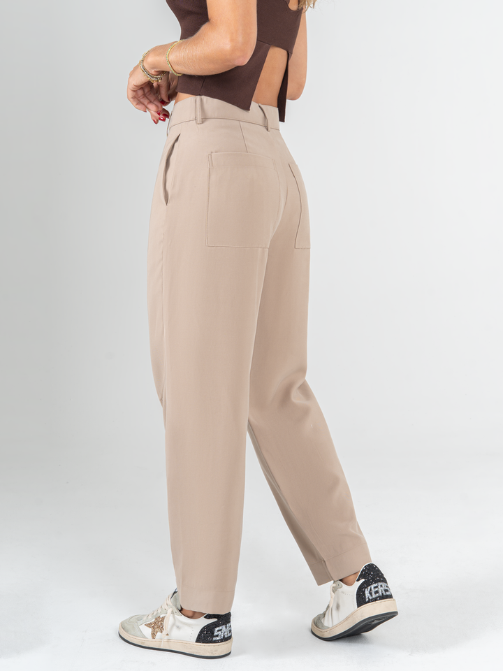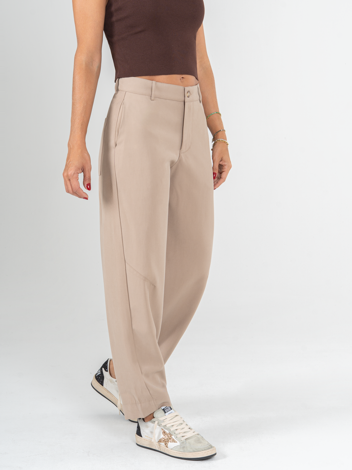 Pantalón slouchy, sin prense, tono caqui, tejido plano liviano, tiro alto, bolsillo diagonal, silueta amplia.