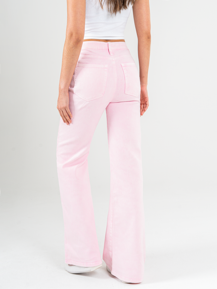 Pantalón palazzo stretch, tiro alto, tono rosa, diseño cinco bolsillos, silueta holgada