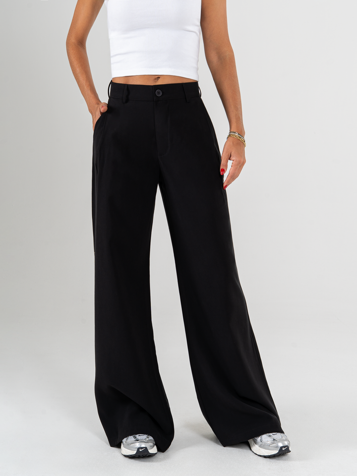Pantalón palazzo, prenses, tono negro, tejido plano liviano, tiro alto, bolsillo al diagonal, silueta amplia.