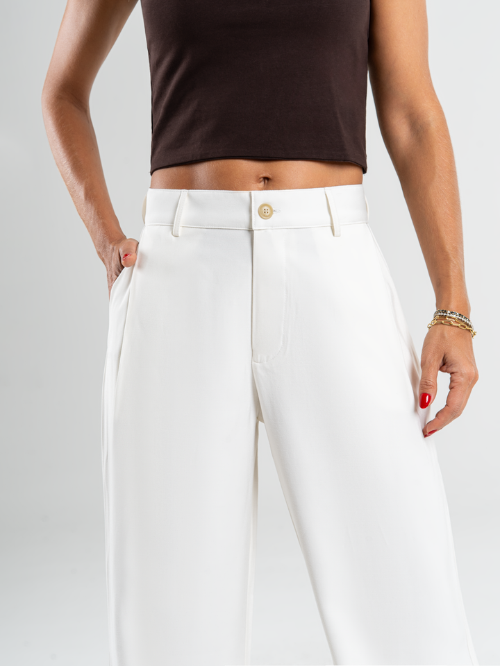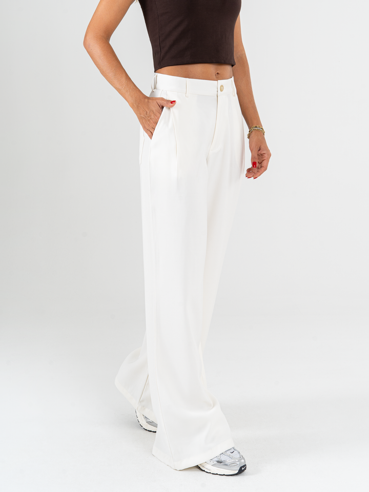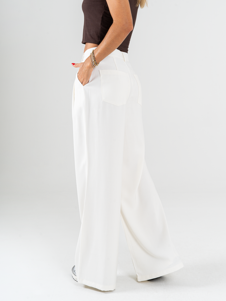 Pantalón palazzo, prenses, tono ivory, tejido plano liviano, tiro alto, bolsillo al diagonal, silueta amplia.