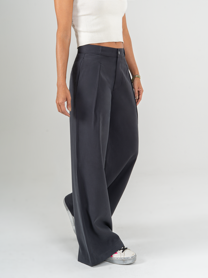 Pantalón palazzo, prenses, tono gris, tejido plano liviano, tiro alto, bolsillo ribete, silueta amplia.