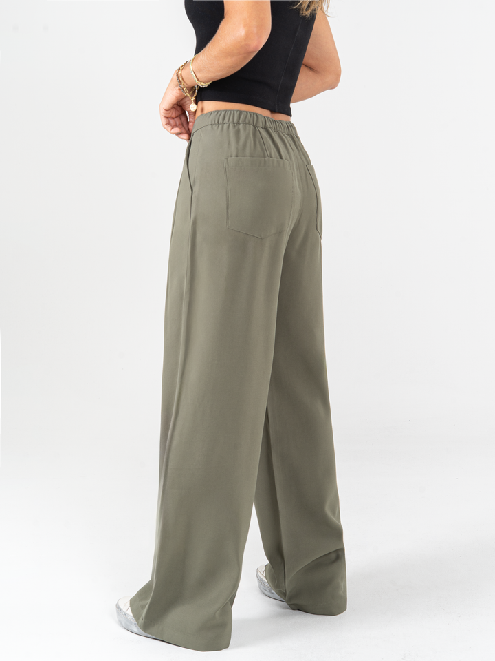 Pantalón mom flare tejido liviano, pretina resortada, prenses, tono verde, tiro alto, bolsillo diagonal.
