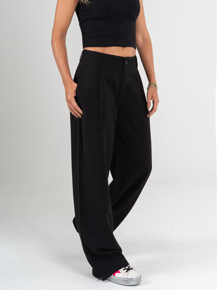 Pantalón wide leg, tejido plano liviano, tiro alto,  ajustador en bota, tono negro, bolsillo ribete, silueta amplia