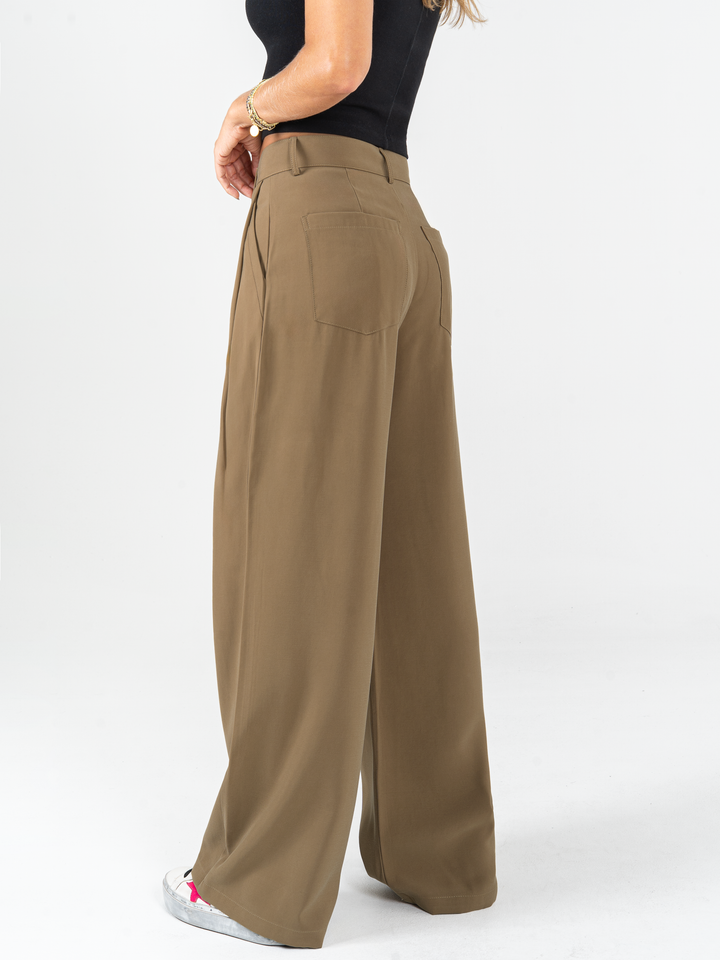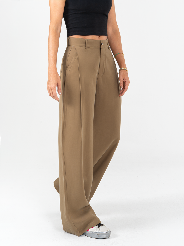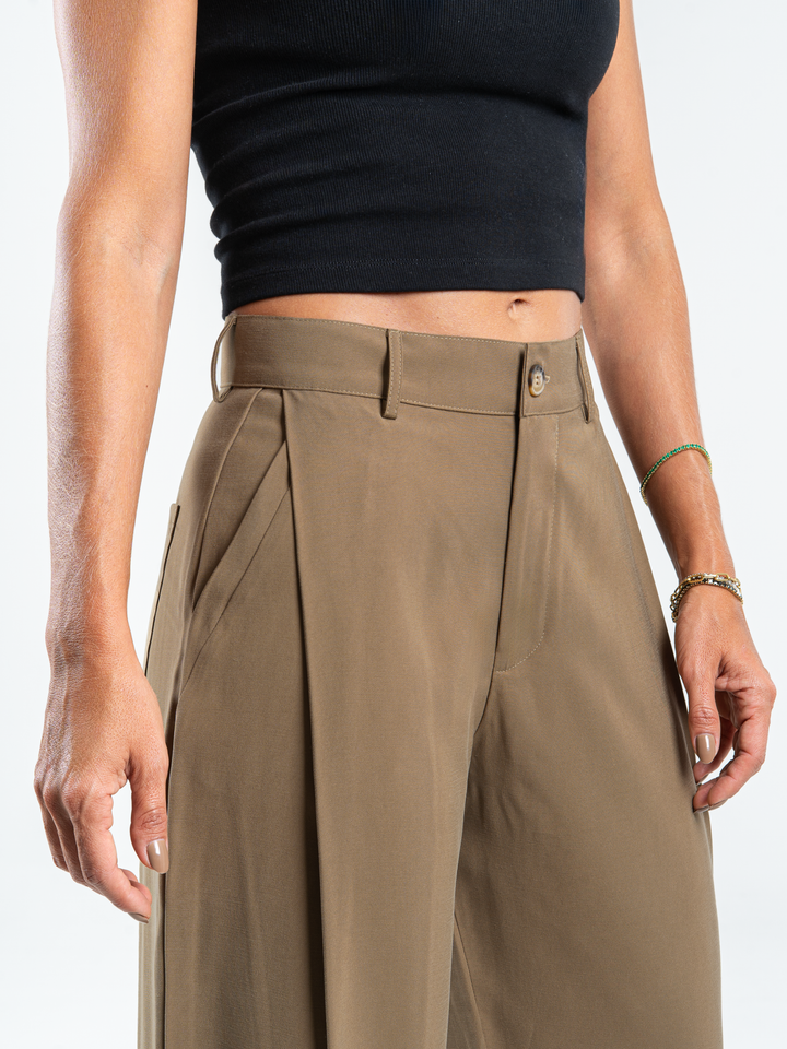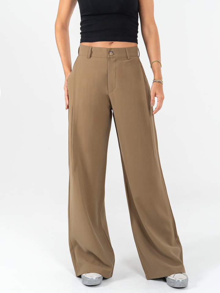 Pantalón palazzo, prenses, tono verde oliva, tejido plano liviano, tiro alto, bolsillo al diagonal, silueta amplia.