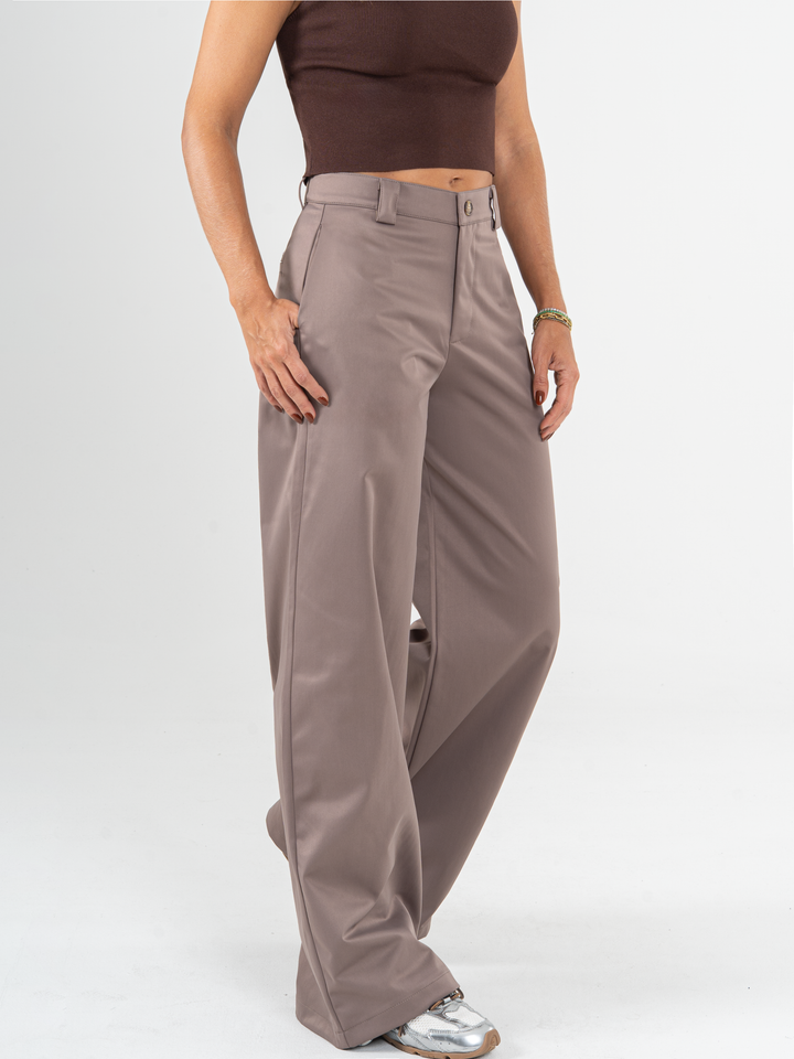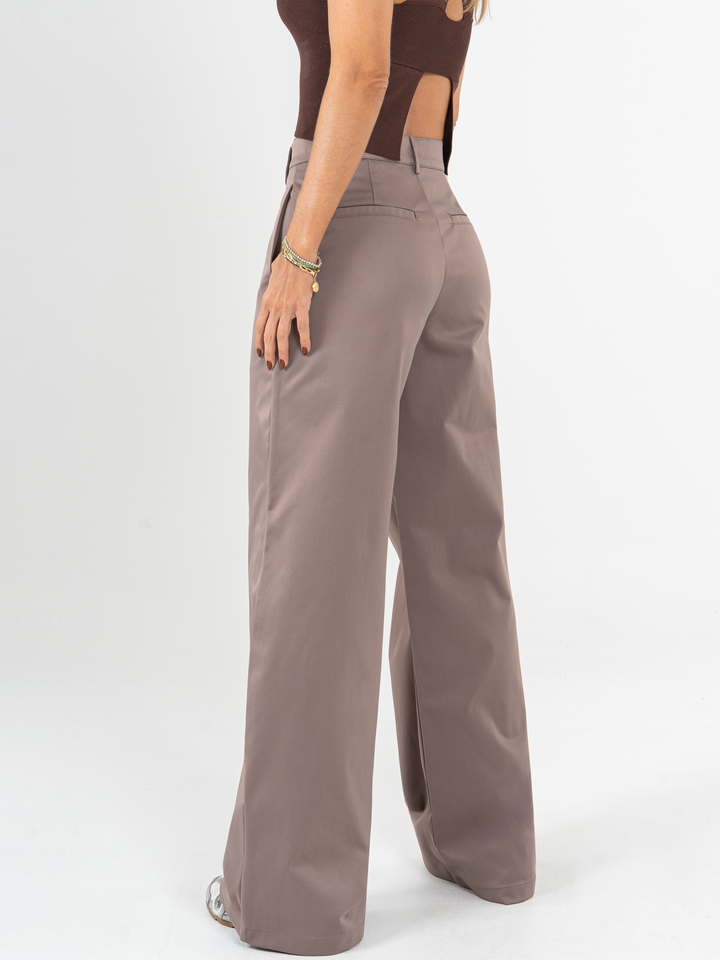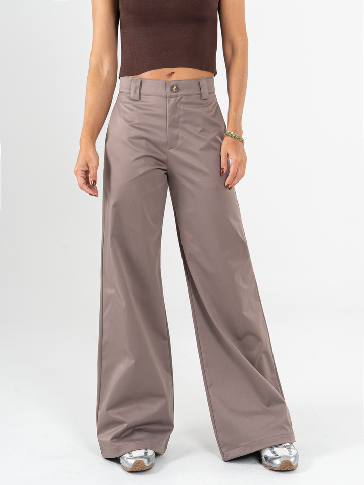 Pantalón palazzo, sin prense, tiro alto, tejido plano liviano, tono cafe, bolsillo ribete, silueta amplia.