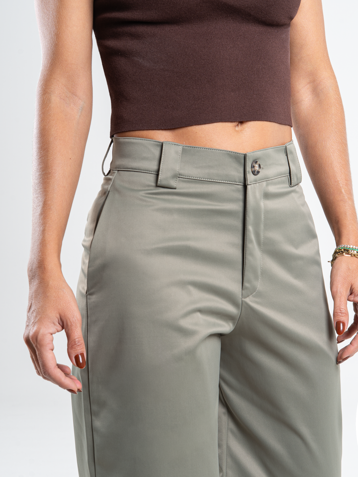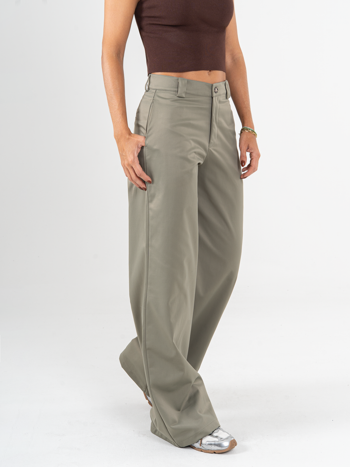 Pantalón palazzo, sin prense, tiro alto, tejido plano liviano, tono verde, bolsillo ribete , silueta amplia.