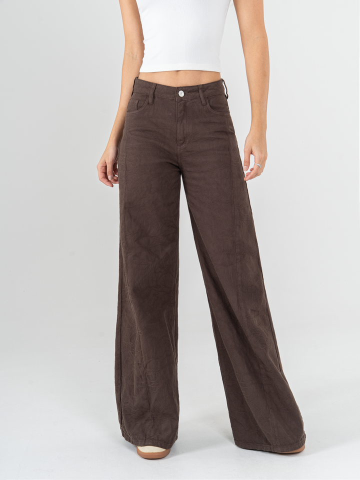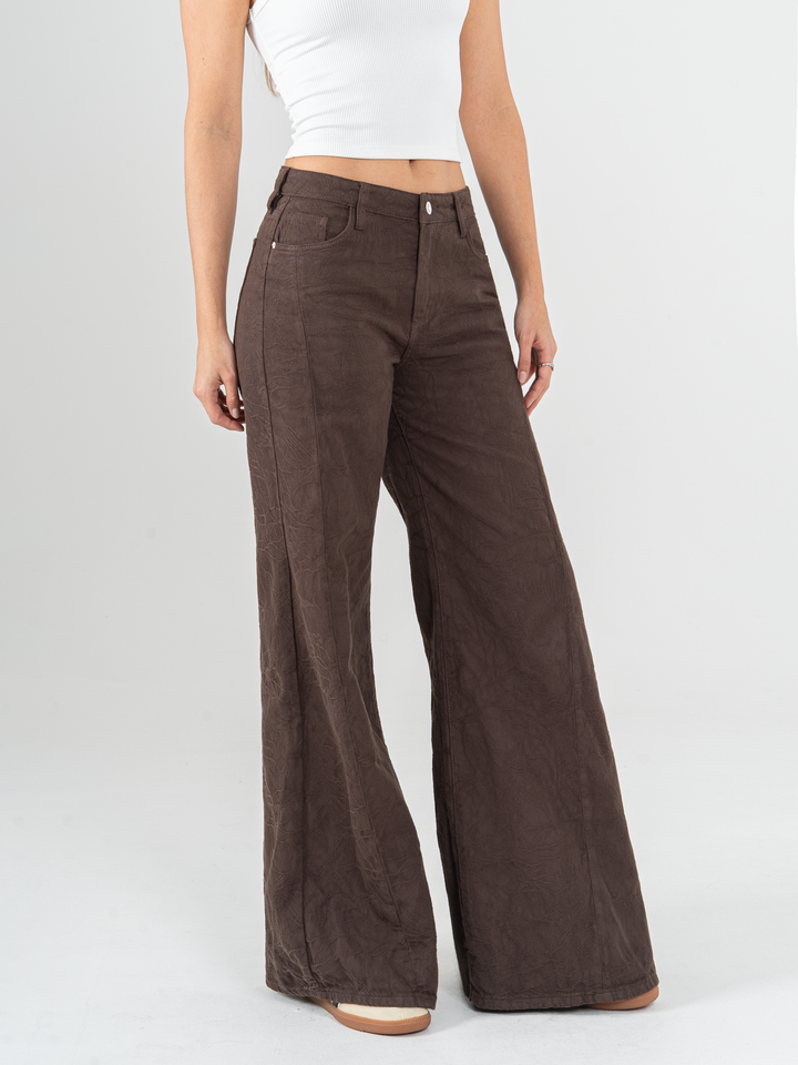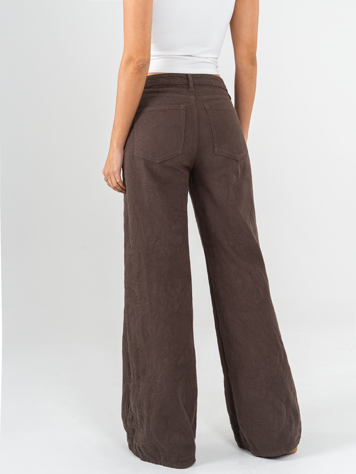 Pantalón palazzo, tiro medio,  detalle de tela bordada, rígido, tono cafe, diseño 5 bolsillos, cintura ajustada y silueta amplia de pierna recta.