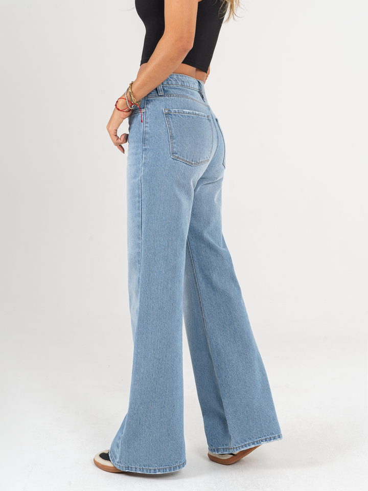Ref: 065886 Jean wide leg, tiro alto, bolsillos delanteros, rígido, tono azul medio