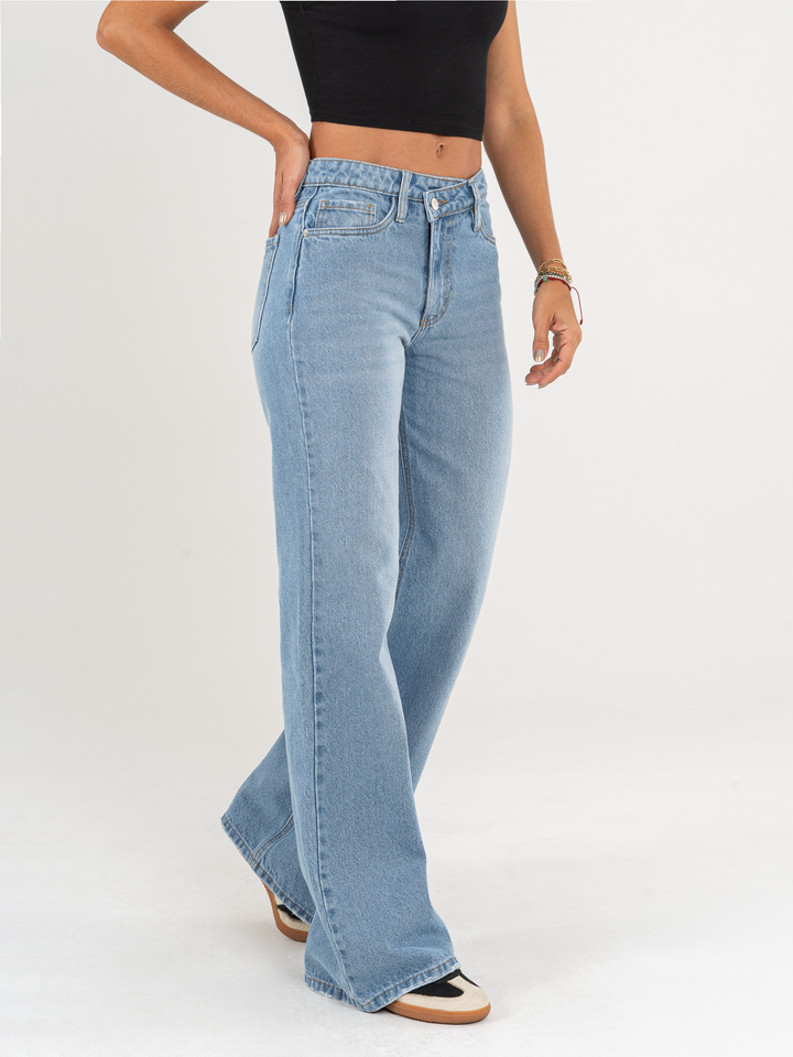 Ref: 065757 Jean palazzo, rígido, tiro alto, detalle en pretina, tono azul claro