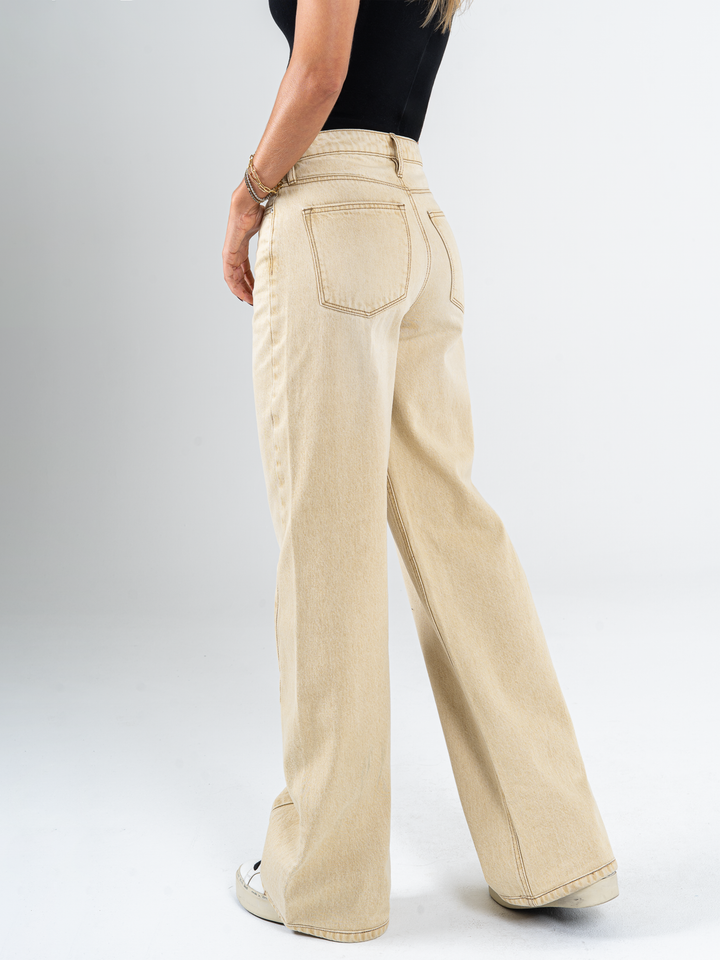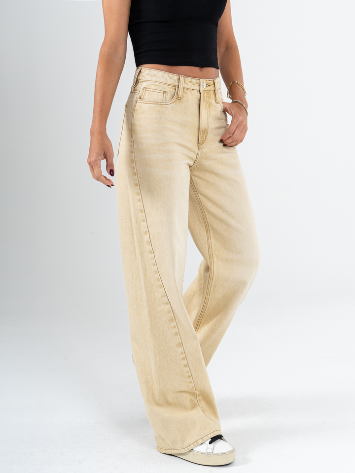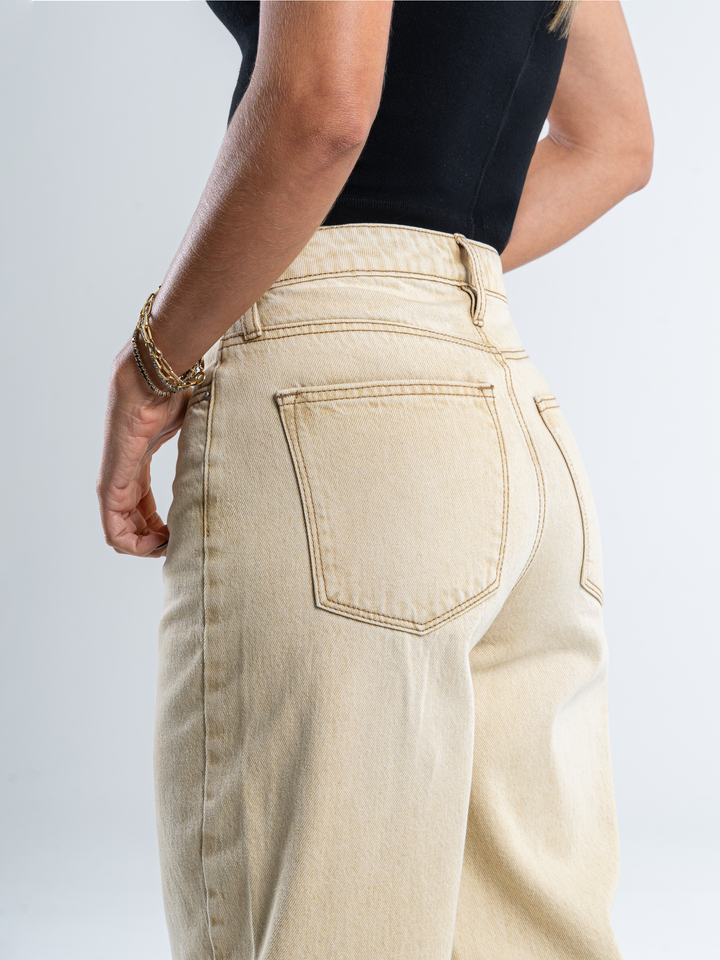 Ref: 065690 Jean wide leg, tiro medio, con cortes, rígido, tono caqui con efecto desgastado