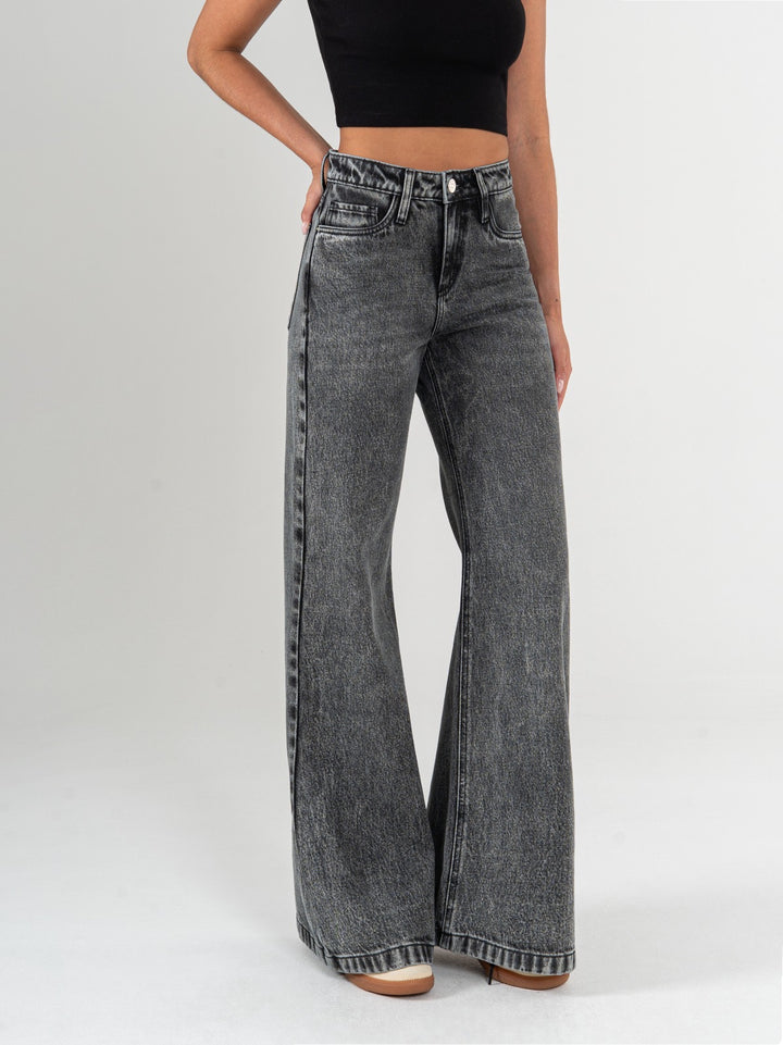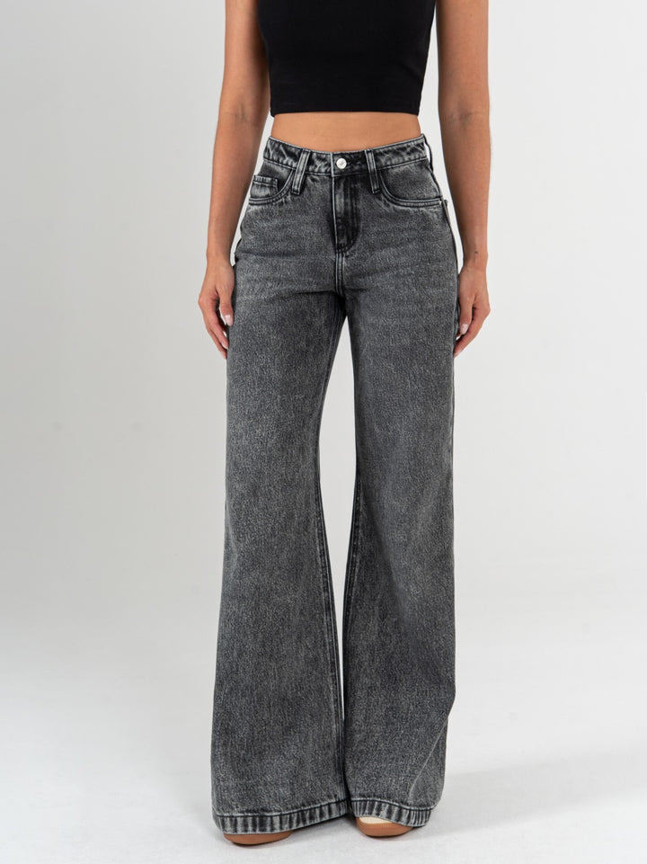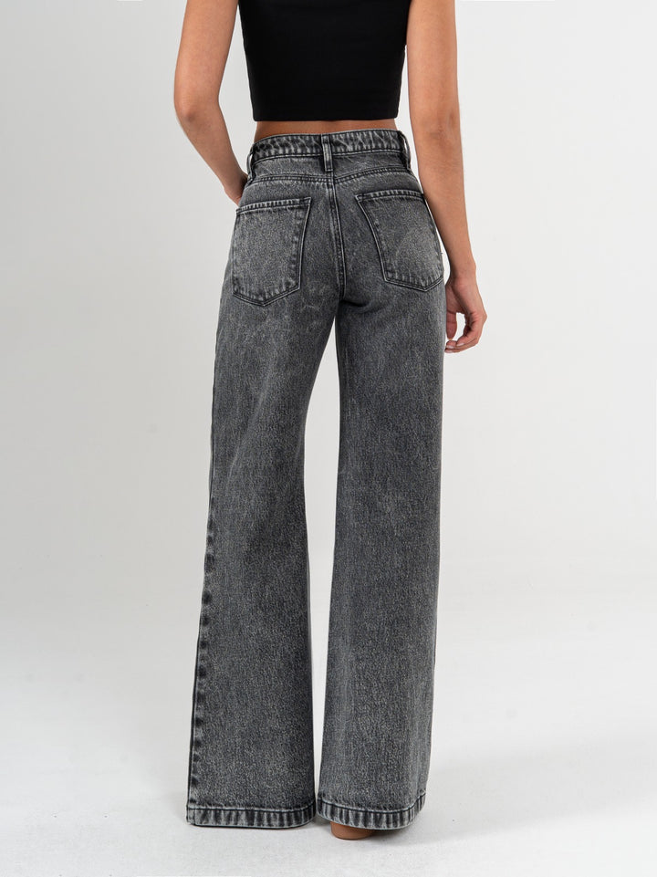 Jean palazzo, rígido, tiro medio, tono gris medio, cintura ajustada pierna holgada, diseño cinco bolsillos.