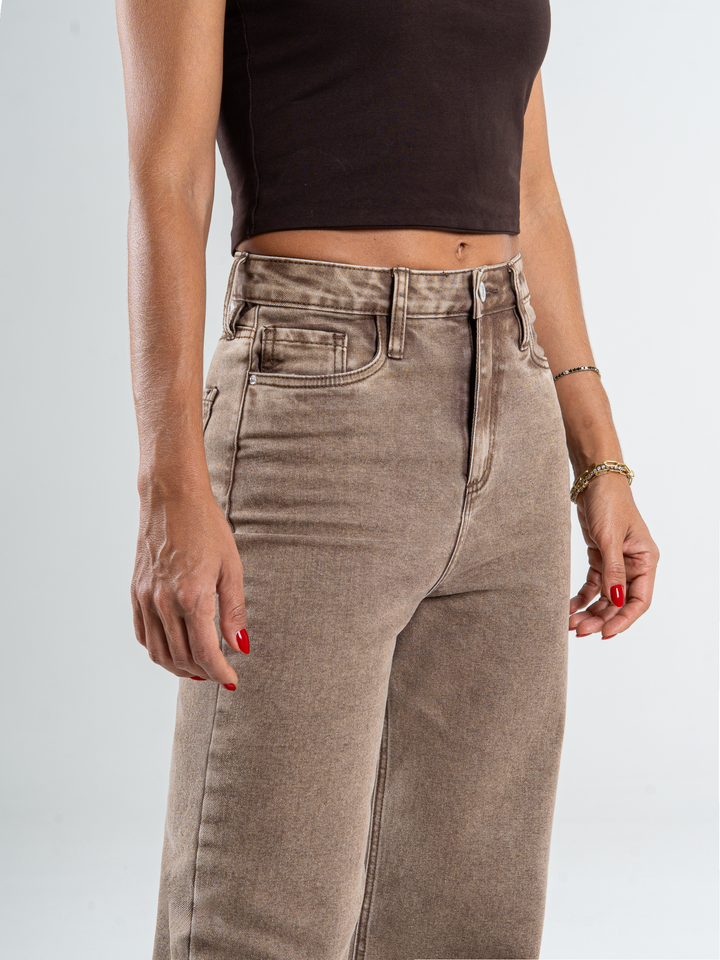 Ref: 065809 Pantalón flare stretch, bota ancha, tiro alto, tono café, silueta ajustada