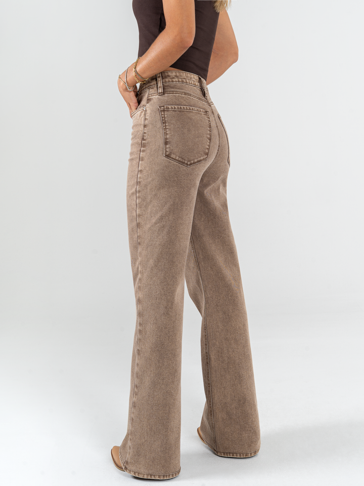Pantalón flare stretch, bota ancha, tiro alto, tono café, silueta ajustada, diseño cinco bolsillos