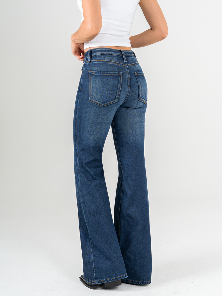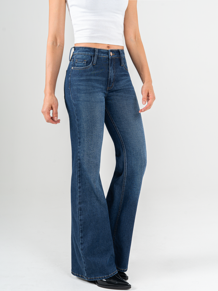 Jean flare stretch, bota ancha, tiro alto, tono azul medio oscuro, silueta ajustada, diseño cinco bolsillos.