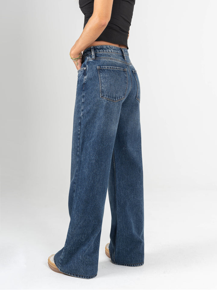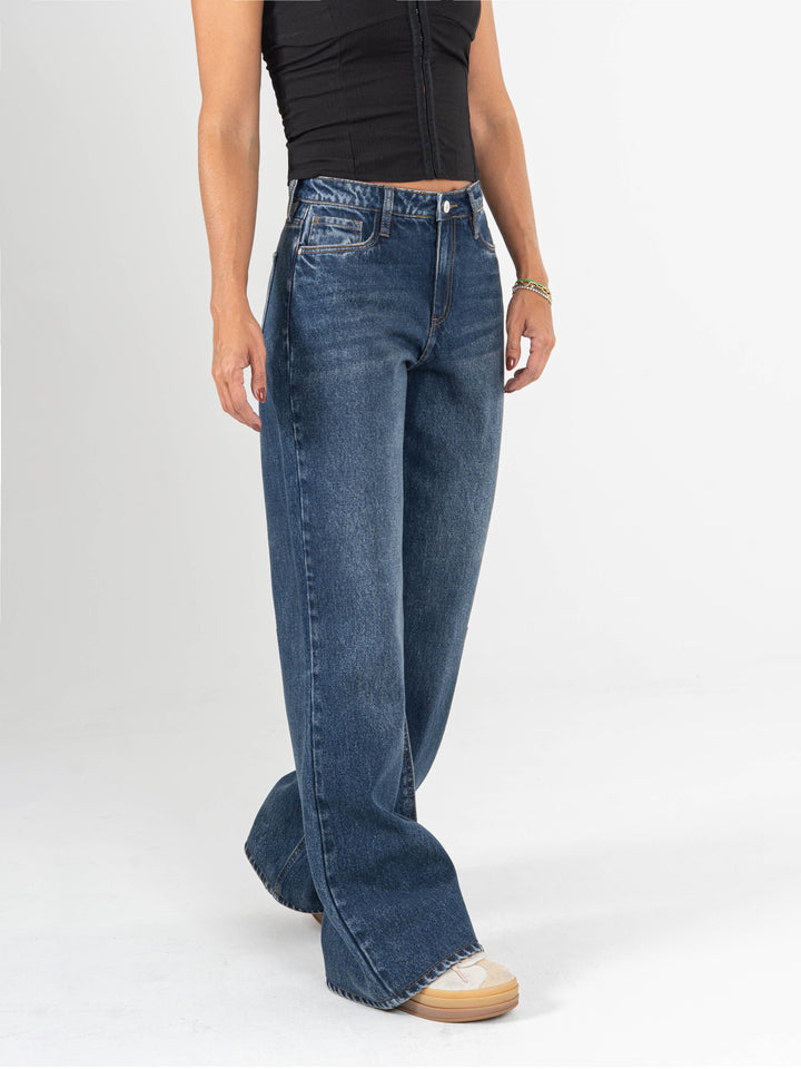 Jean Mom Flare, rígido, tiro alto, tono azul oscuro, diseño cinco bolsillos, cintura ajustada, pierna holgada.
