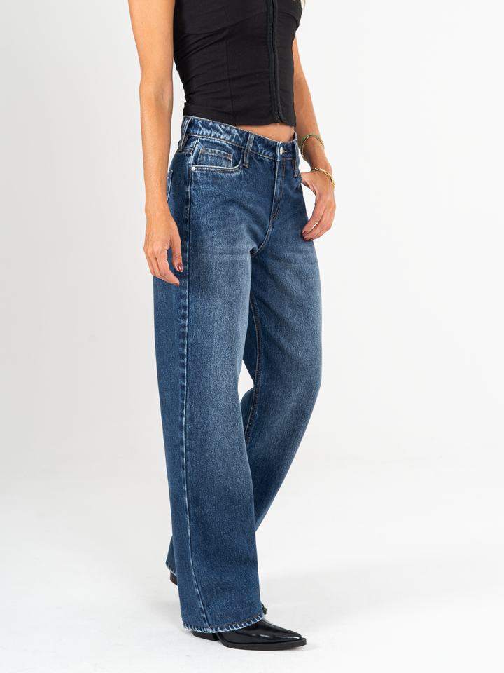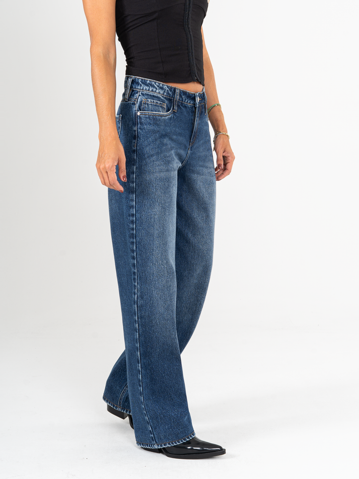 Ref: 065883 Jean wide leg, tiro medio, con cortes, rígido, tono azul oscuro