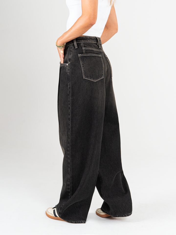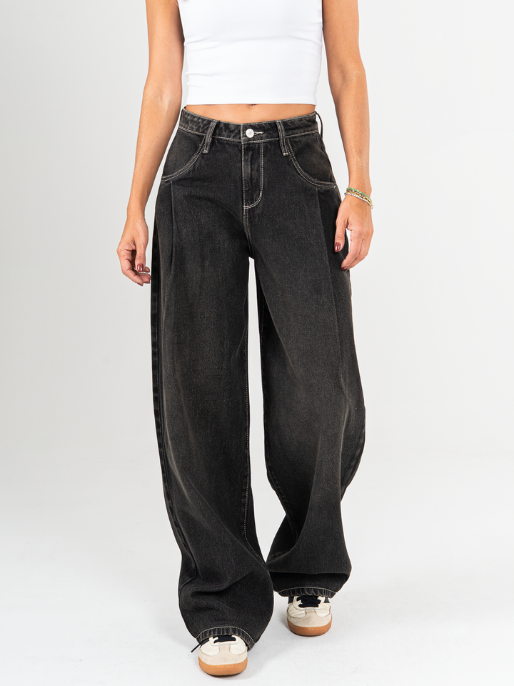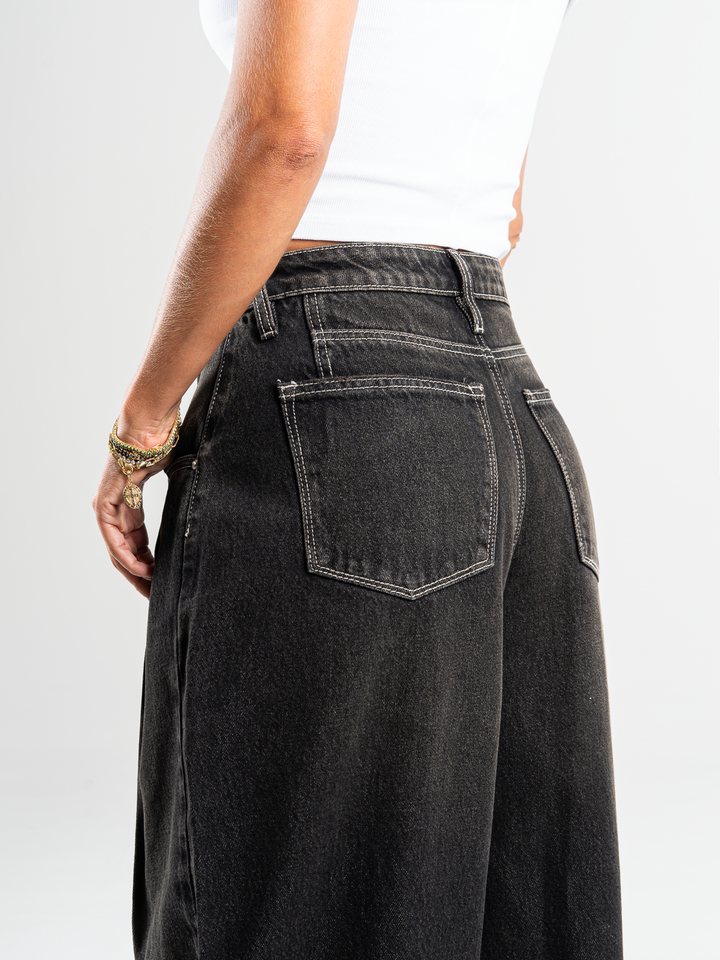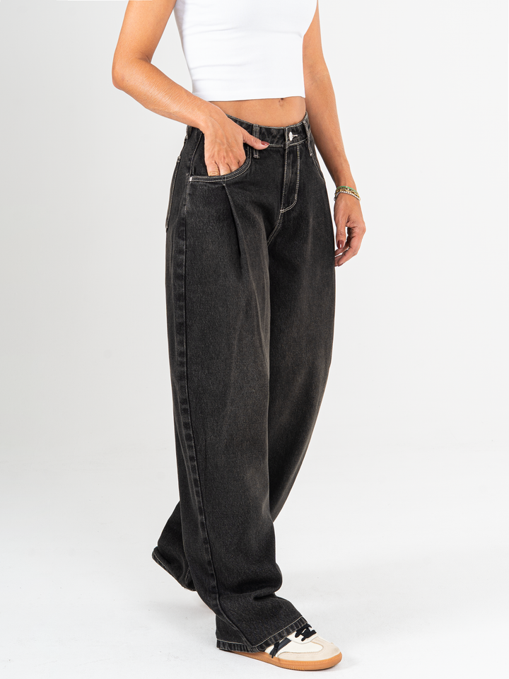 Jean wide leg, tiro alto, con prenses, rígido, tono gris oscuro, diseño 5 bolsillos, cintura ajustada y silueta amplia de pierna recta.