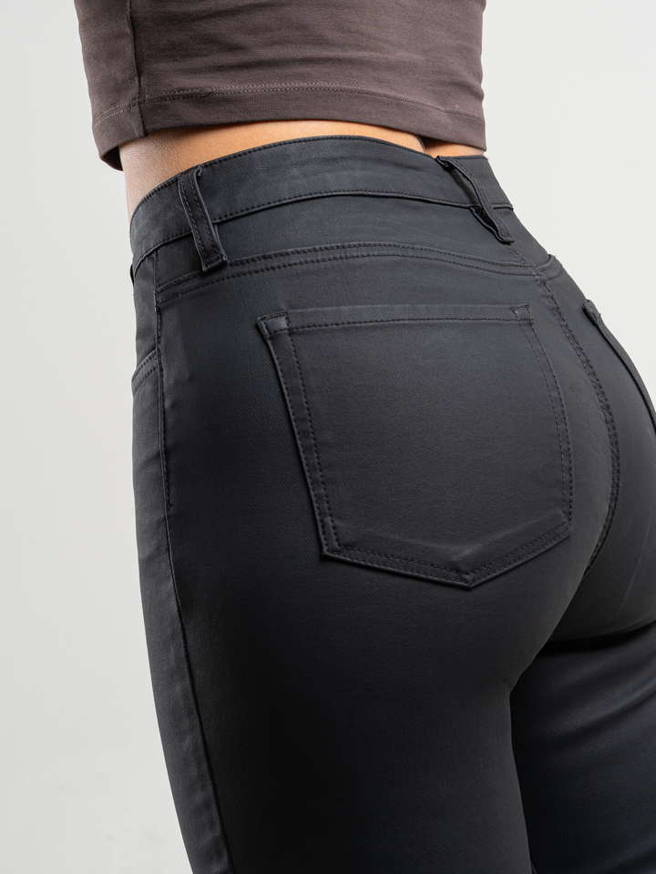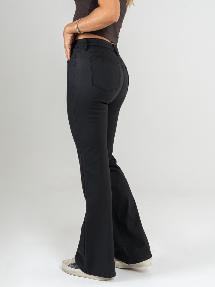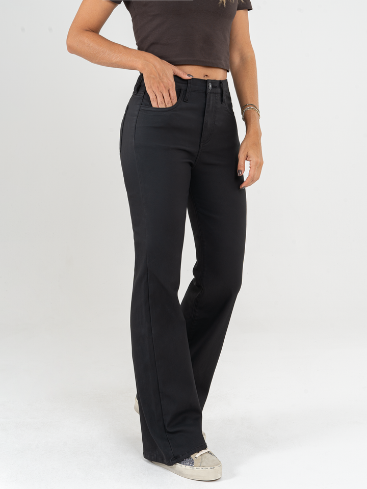 Pantalón flare stretch, bota ancha, efecto cuero, tiro alto, tono negro, diseño cinco bolsillos, silueta ajustada.