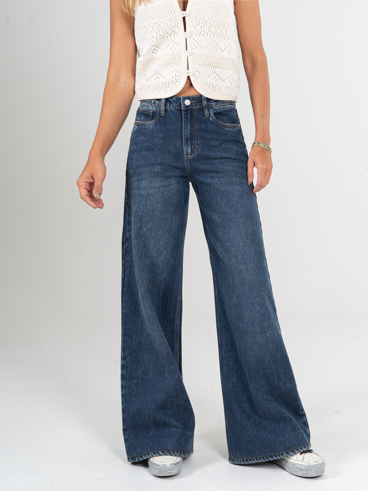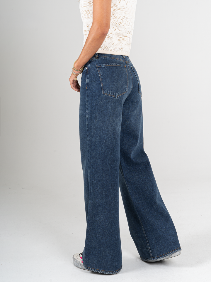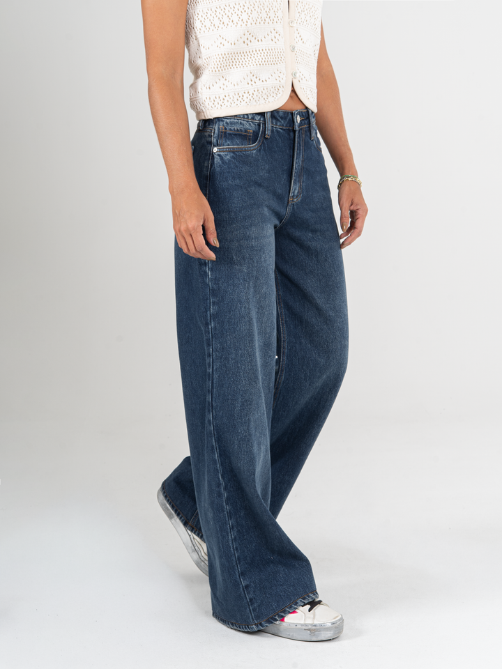 Jean palazzo, rígido, tiro alto, tono azul oscuro, cintura ajustada pierna holgada, diseño cinco bolsillos.