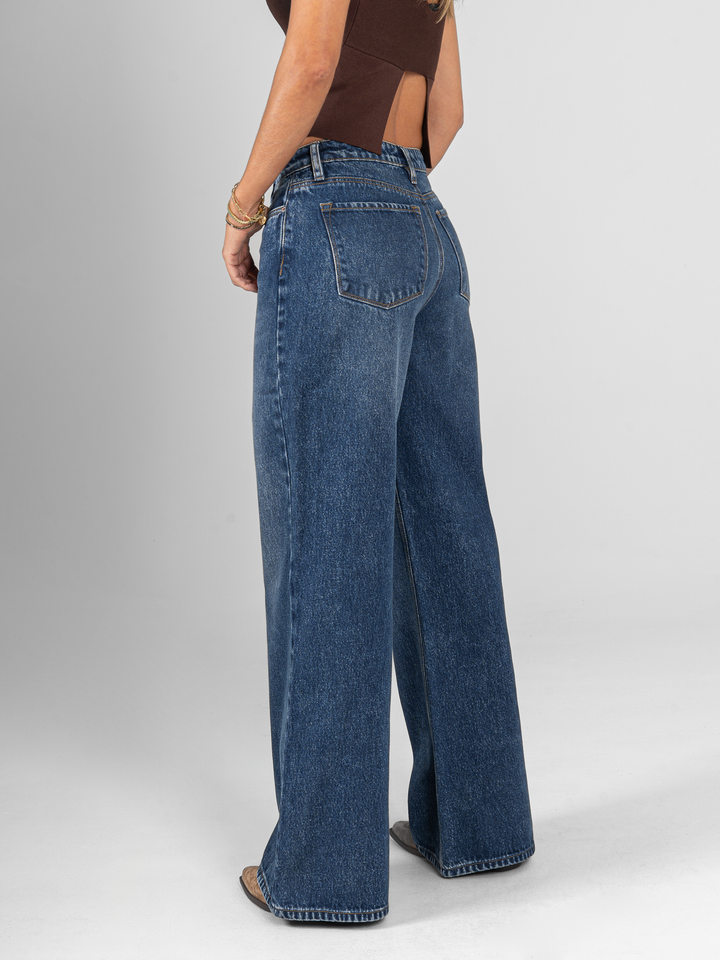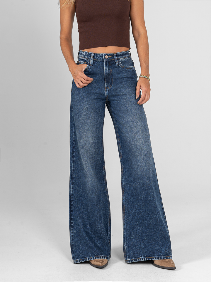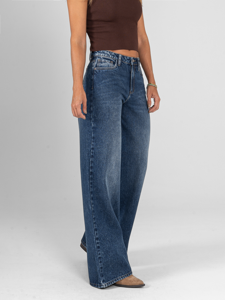 Jean palazzo, rígido, tiro medio, tono azul oscuro, cintura ajustada pierna holgada, diseño cinco bolsillos.