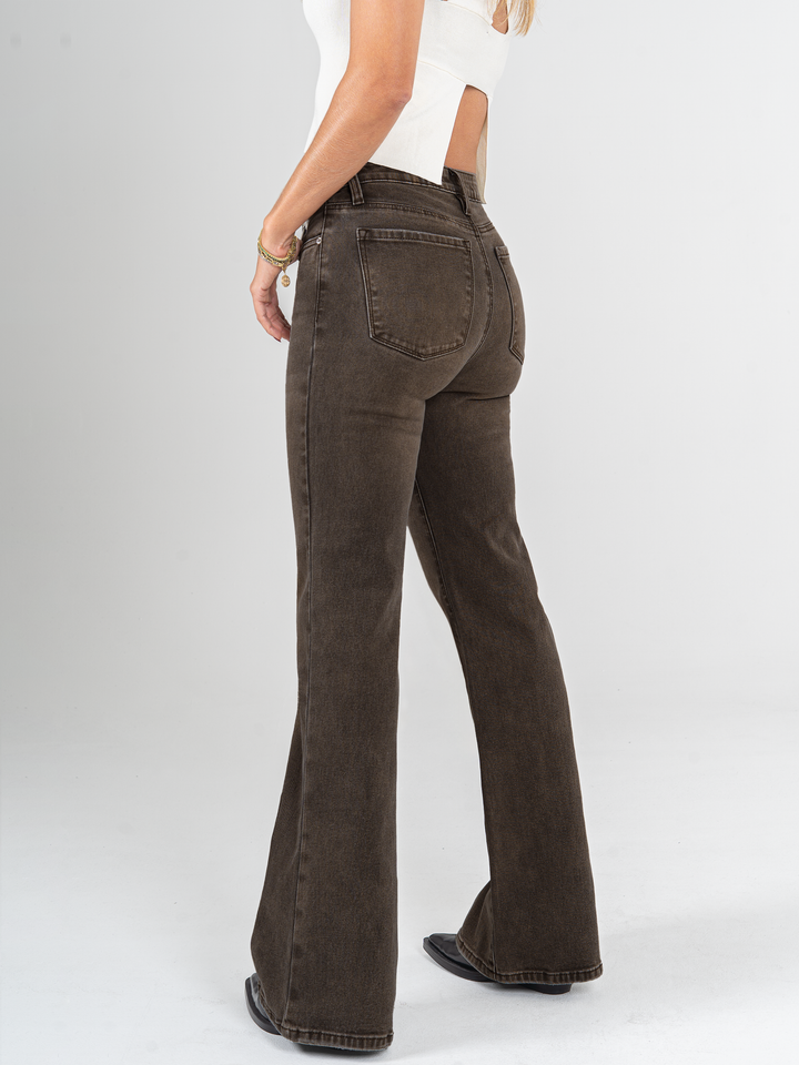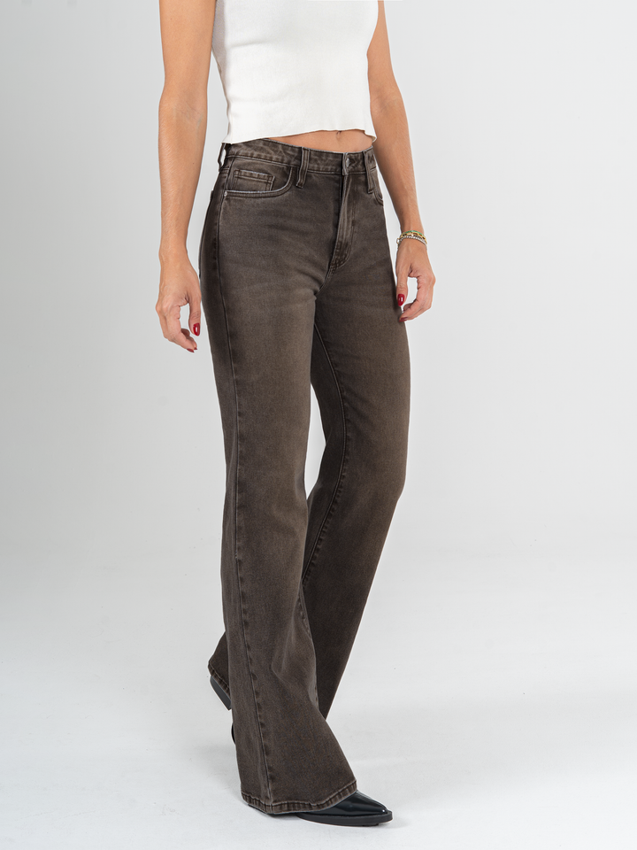 Jean flare stretch, bota ancha, tiro alto, tono cafe, silueta ajustada, diseño cinco bolsillos.
