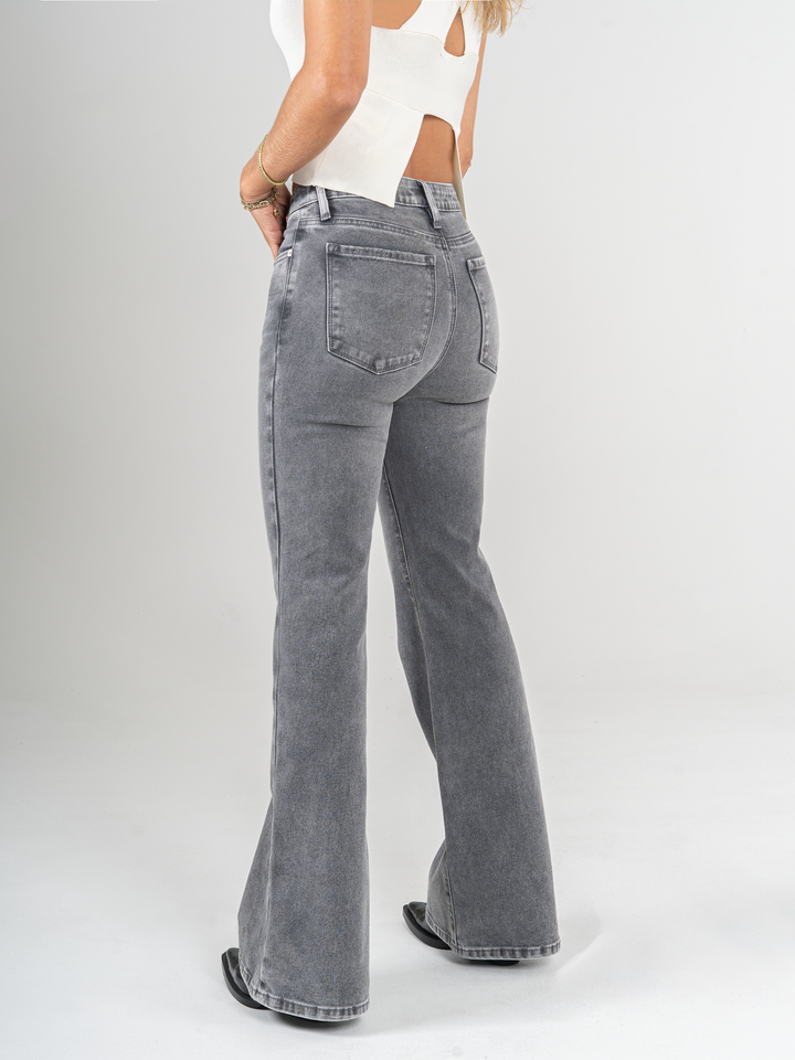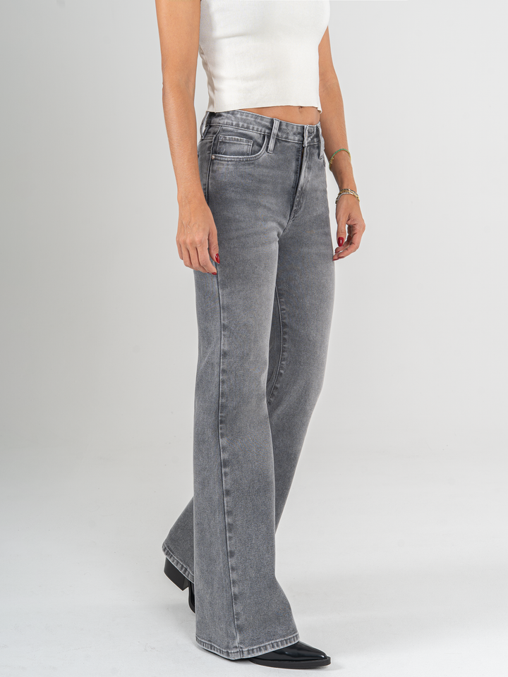 Jean flare stretch, bota ancha, tiro alto, tono gris, silueta ajustada, diseño cinco bolsillos.