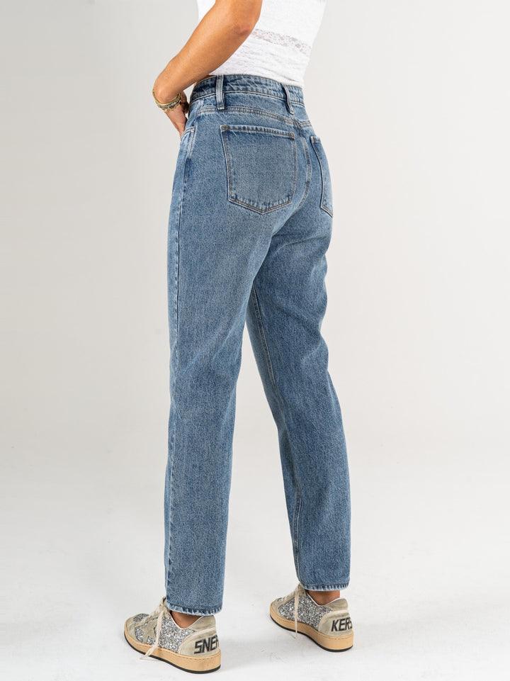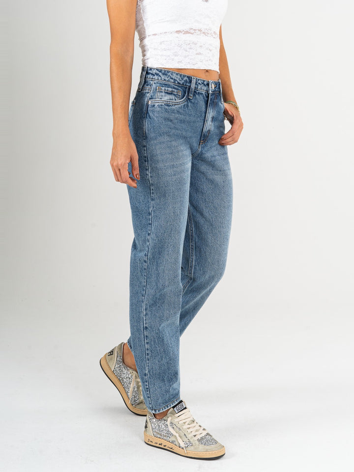Jean Mom fit, rígido, tiro alto, tono azul medio oscuro, cintura ajustada pierna holgada, diseño cinco bolsillos.