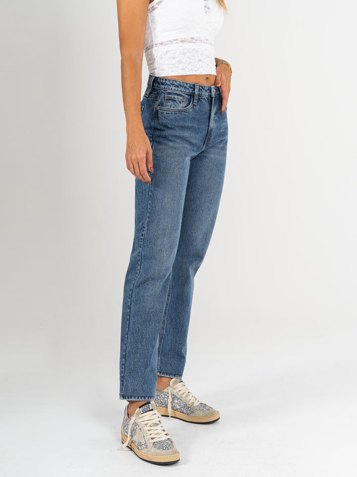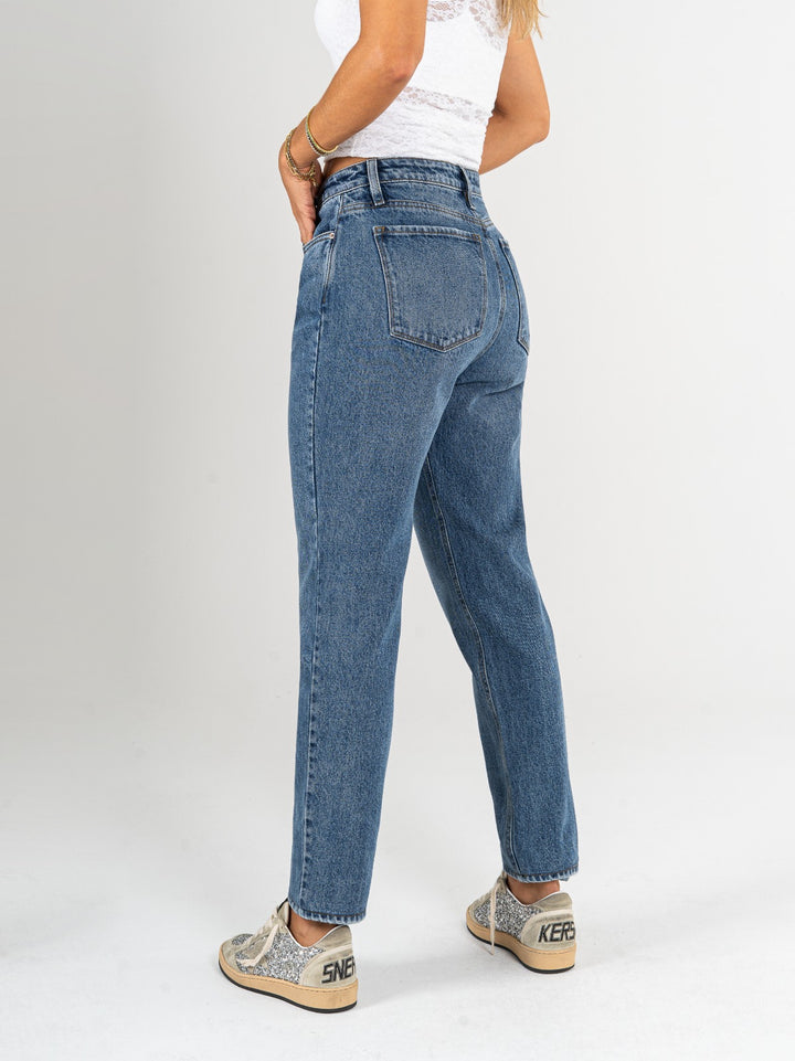 Jean Mom fit, rígido, tiro alto, tono azul medio, cintura ajustada pierna holgada, diseño cinco bolsillos.